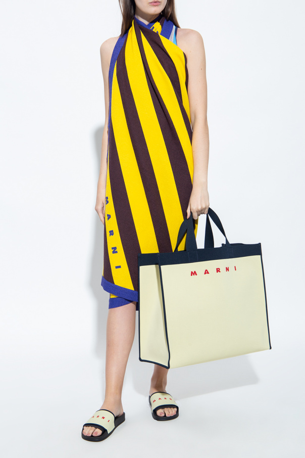 Beige and black slides from Marni. Crafted from canvas embroidered with a red logo, this pair rests on a black rubber sole.