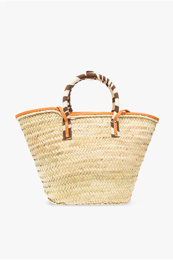 Beige ‘Le Panier Soli’ shopper bag from Jacquemus. Handcrafted from natural palm leaves with a leather trim in orange, brown and cream, this design secures with a lobster clasp and showcases an animal motif and a gold-tone metal logo plaque. It is complete with a slip pocket on the front, two half-round handles with snap-button tabs, two shoulder straps, gold-tone metal hardware and one internal compartment.