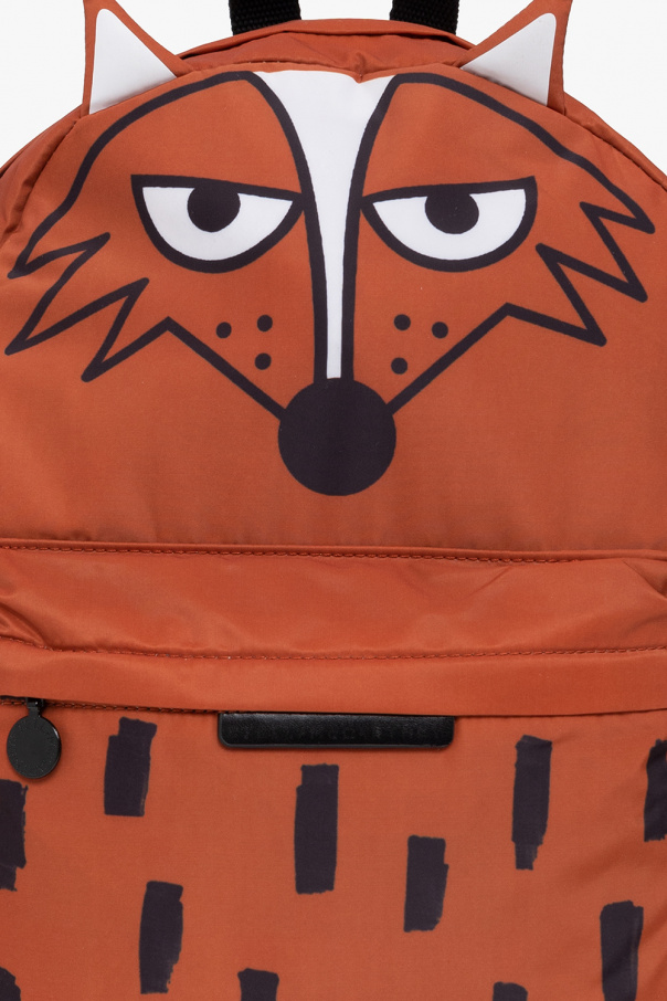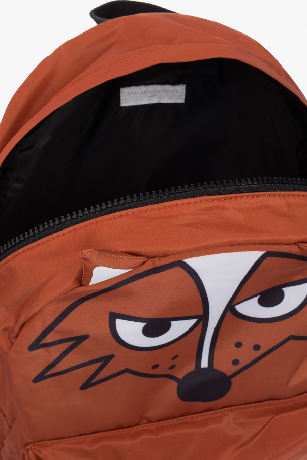 Brown backpack from Stella McCartney Kids. Made of recycled materials, this model fastens with a two-way zip and is decorated with a fox print in black and white. It is complete with a zip pocket, half-round handle, adjustable shoulder straps, one internal compartment and black metal hardware.
