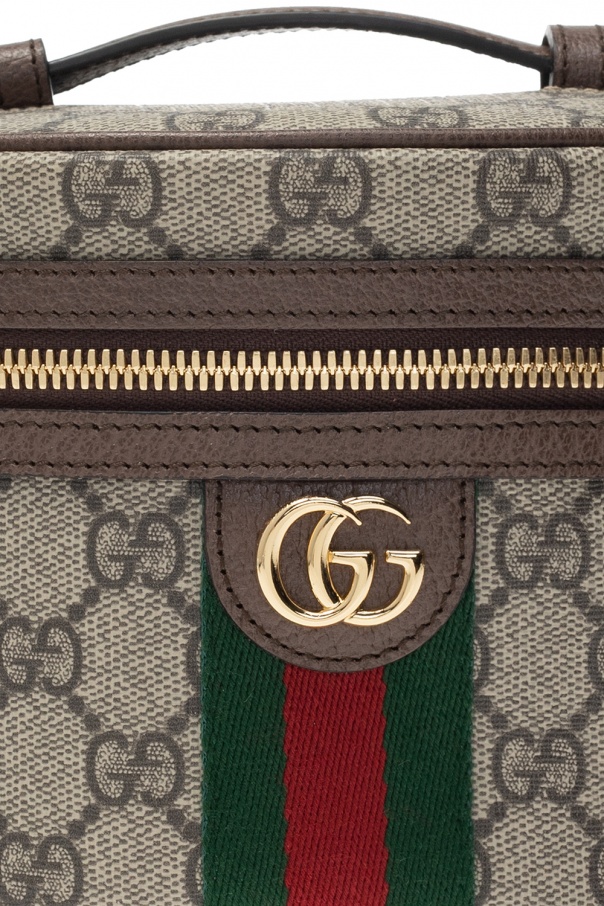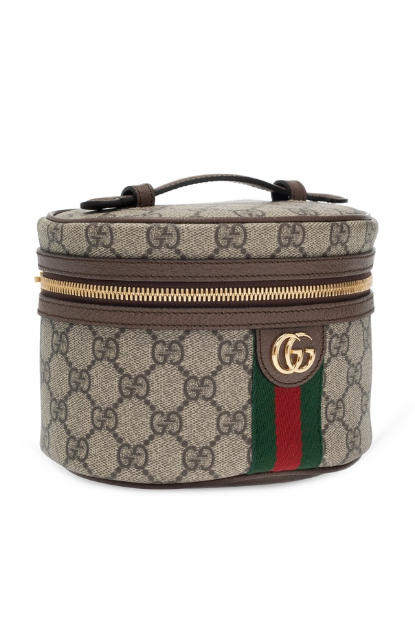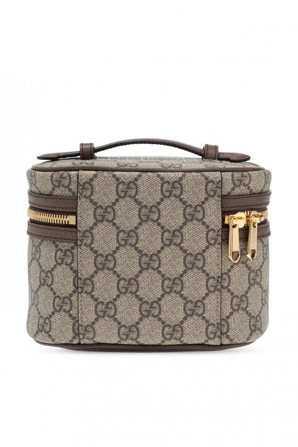 Beige wash bag from Gucci. Crafted from GG Supreme canvas with brown leather trims, this item features a two-way zip fastening, green-red-green Web stripe, half-round handle and main internal compartment with one card slot.