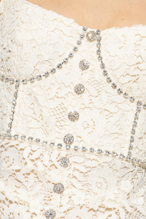 Cream dress from Self Portrait. Made of floral lace, this fitted design features a concealed zip and hook, crystals with corset details, decorative buttons, sweetheart neckline, short sleeves and slit on the front.