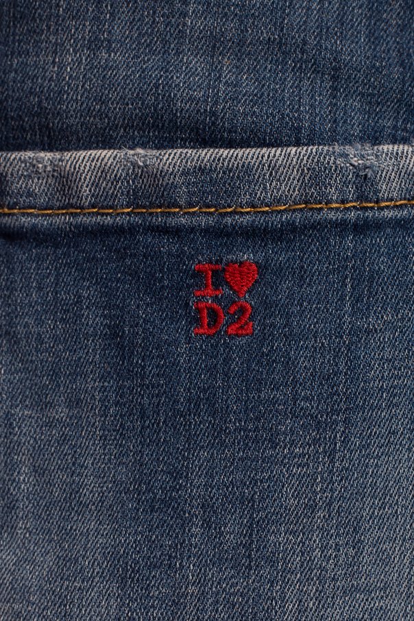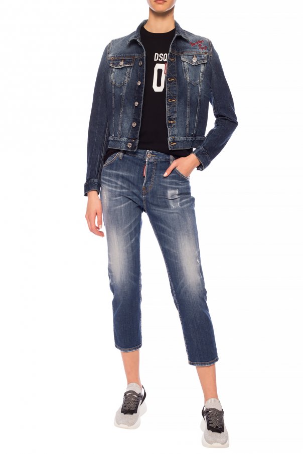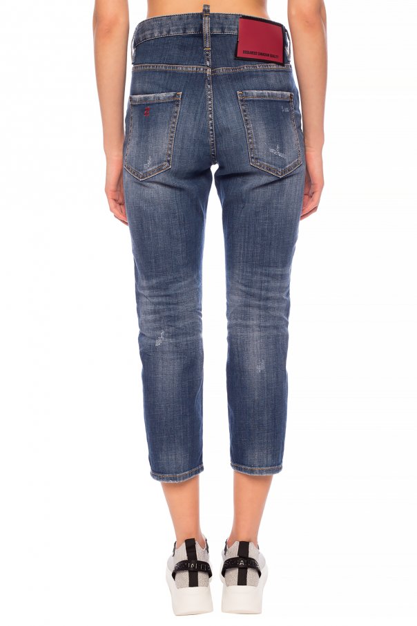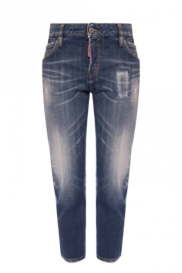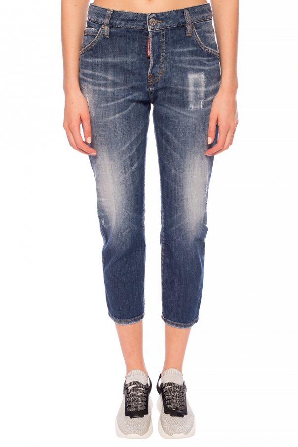 Blue \'Cool Girl\' stonewashed jeans from Dsquared2. Fastened via buttons. Embellished with red and black logo-printed patch. Feature 5-pocket design and tapered legs.