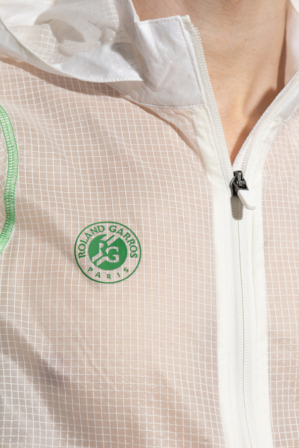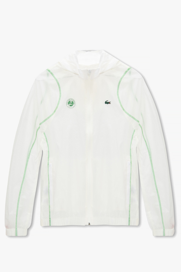 White transparent hooded jacket from Lacoste x Roland Garros. Fastened with a zip, this design features a print, logo patch, two zip pockets and ribbed trims at the hem and cuffs.