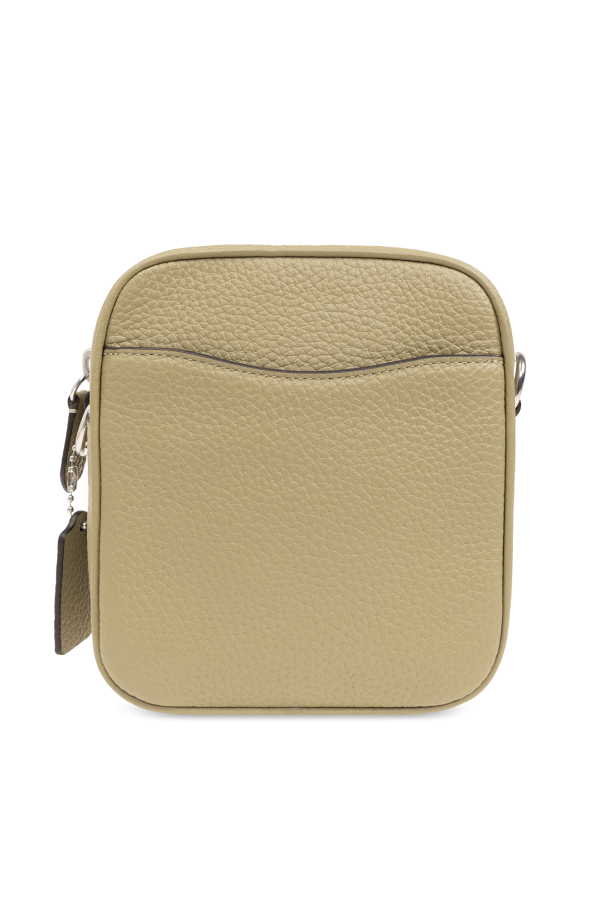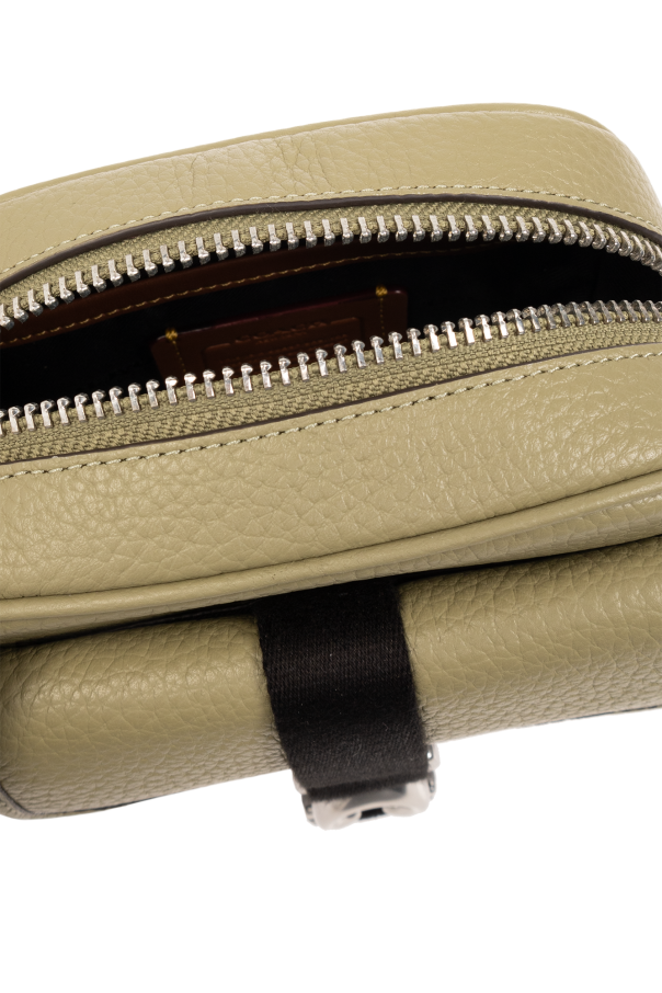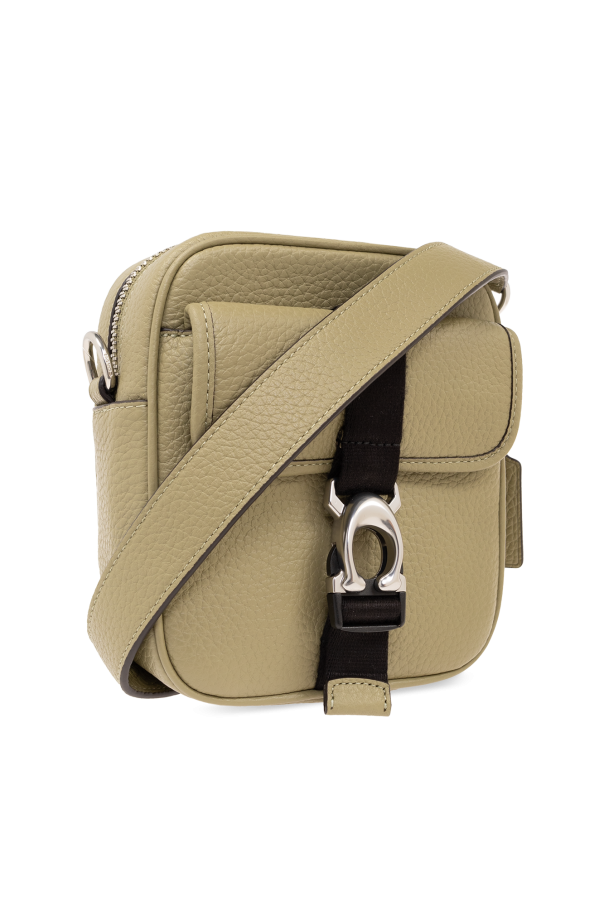 Green shoulder bag from Coach. Made from grained leather, this design fastens via a zip and features one pocket with a black strap and gold-tone logo buckle on the front, one slip pocket on the back, silver-tone metal hardware as well as a detachable and adjustable shoulder strap and one internal compartment with a slip pocket.