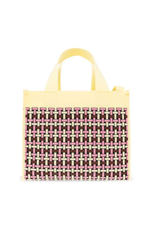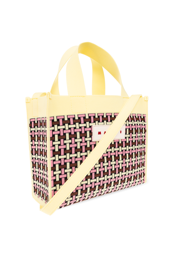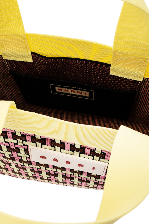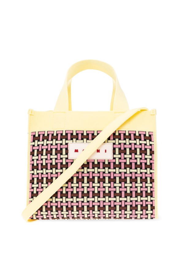 Yellow, pink and brown shoulder bag from Marni. Crafted from fabric, this model features a decorative pattern, logo patch, two half-round handles, gold-tone metal hardware and one internal compartment with one slip pocket.