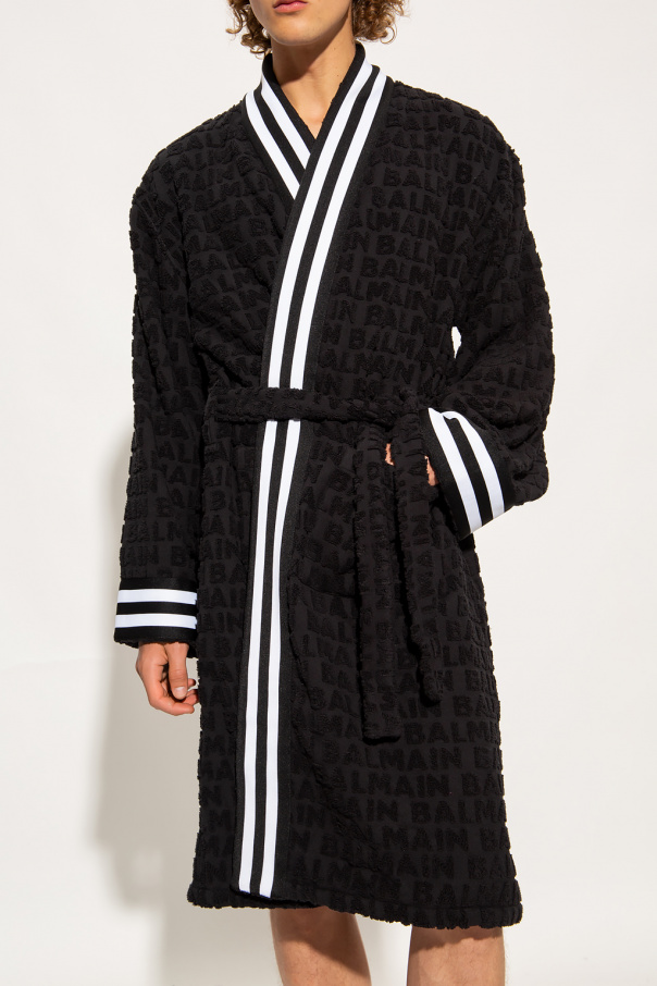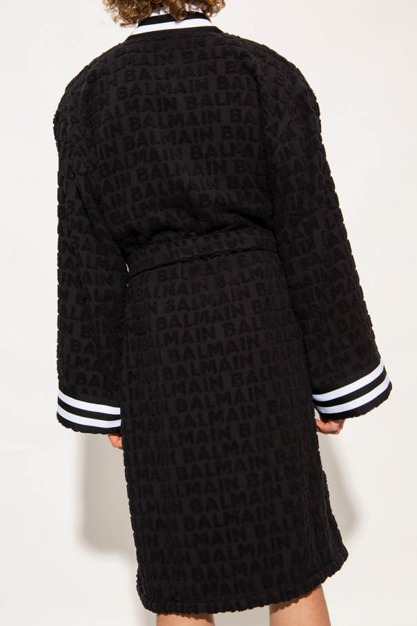 Black bathrobe from Balmain. Made of cotton, this design features an embroidered logo pattern, two slip pockets and ribbed trims in white and black at the hem and cuffs.