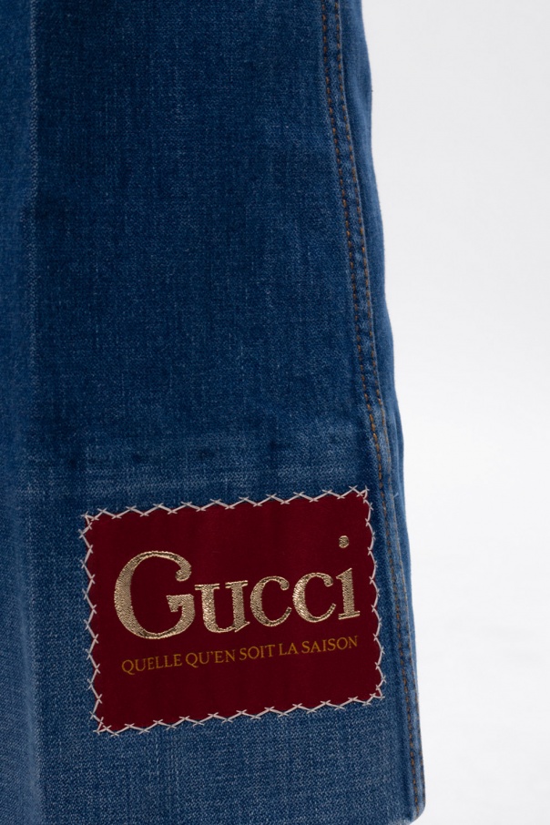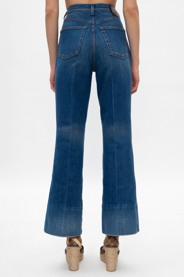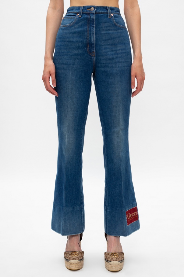 Blue jeans from Gucci. Crafted from stretch cotton into flared leg silhouette, this pair has zip and button fastenings, five pockets and maroon patch embroidered with gold-tone label\'s logo which decorates the front.