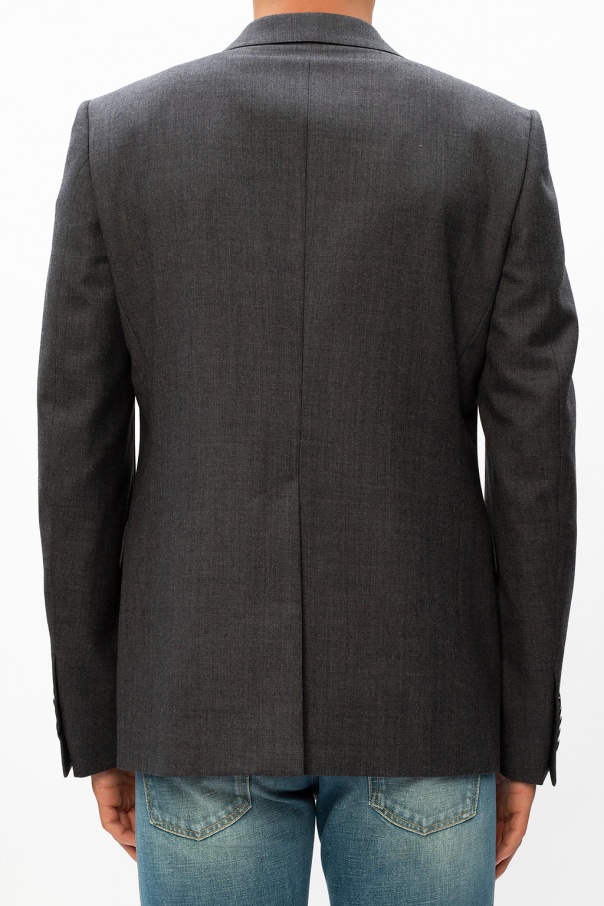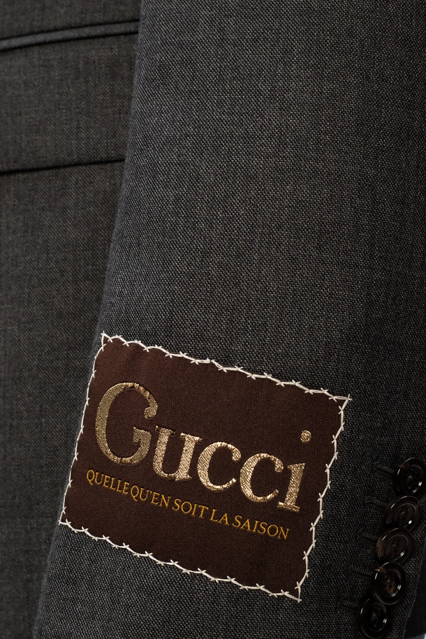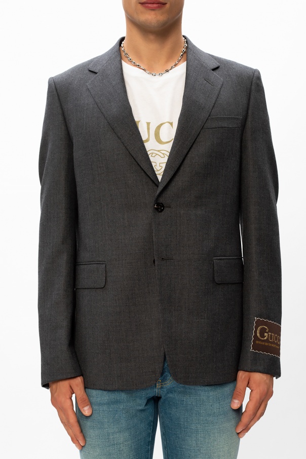 Grey blazer from Gucci. Cut from wool, this design fastens via buttons and employs notched lapels, three pockets on the front and single vent on the back.