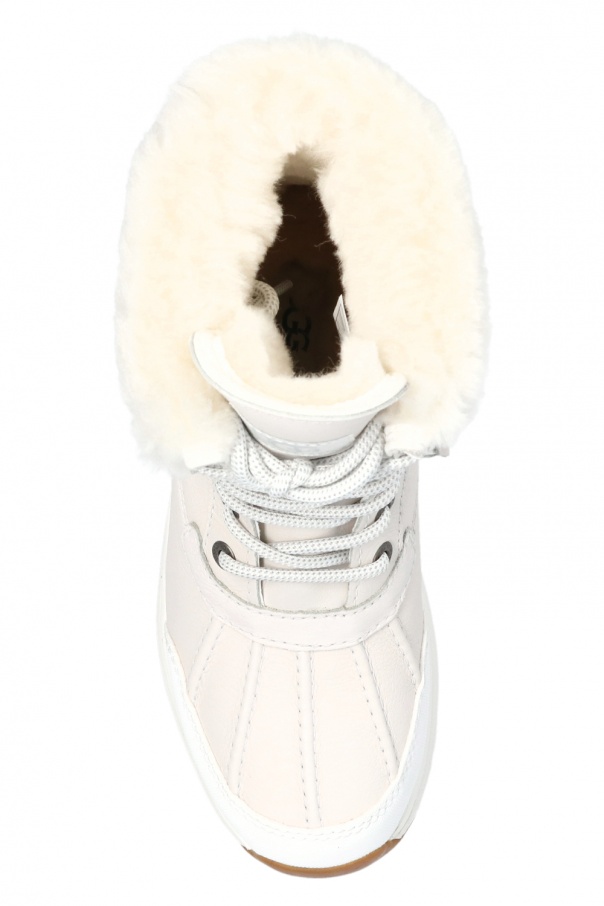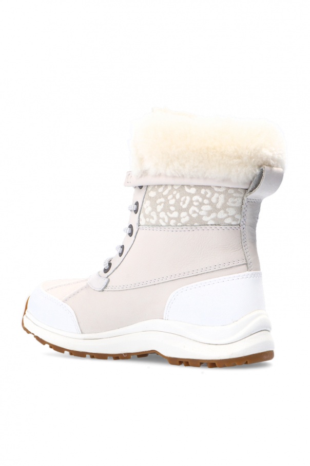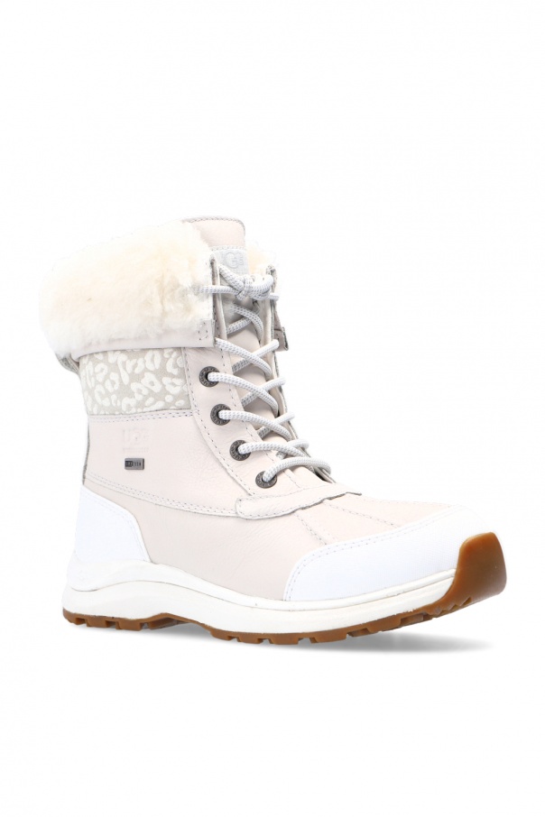 Light beige ‘Adirondack’ lace-up snow boots from UGG. Crafted from certified leather produced with the utmost care for the environment, this water-resistant pair sits on a white and brown rubber sole and showcases silver-tone glittered leopard insert, an embossed logo for the brand recognition and UGGPlush wool padded lining.