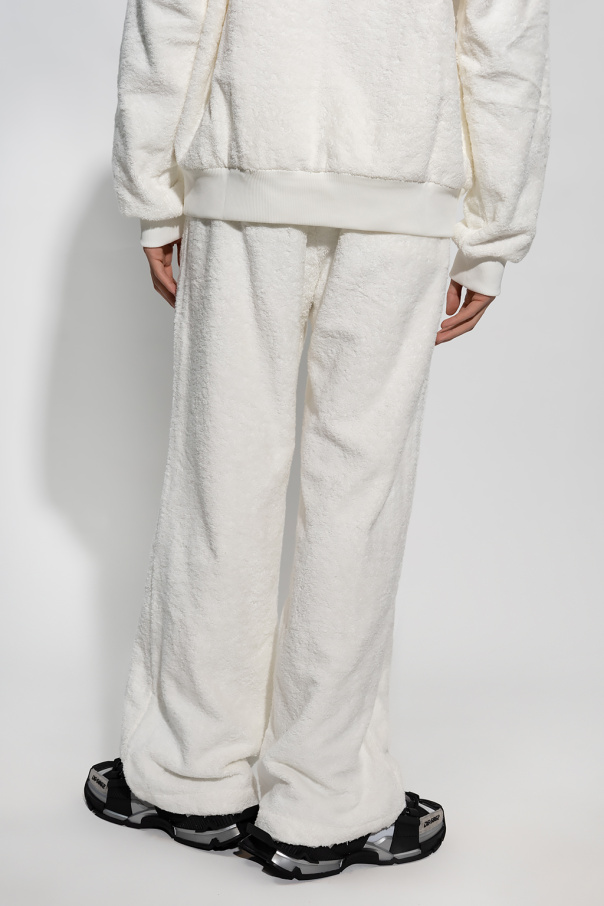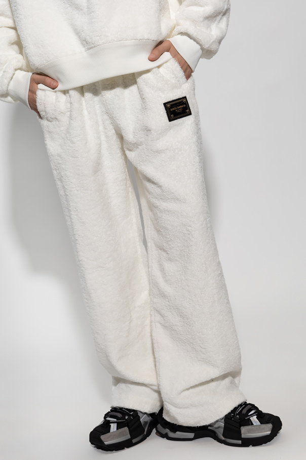 White trousers from Dolce & Gabbana. Crafted in terry cotton, this pair falls with wide legs and features a drawstring waistband, two slip pockets, one zip pocket and a logo-engraved patch for brand recognition.