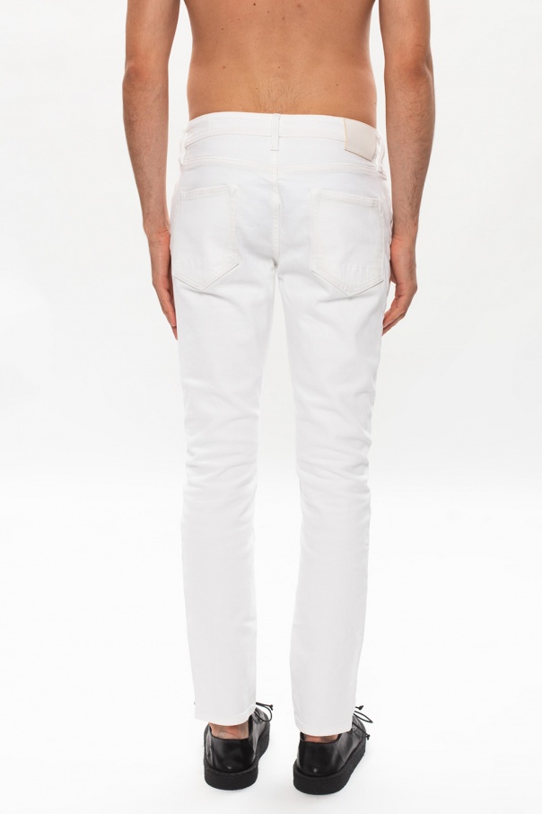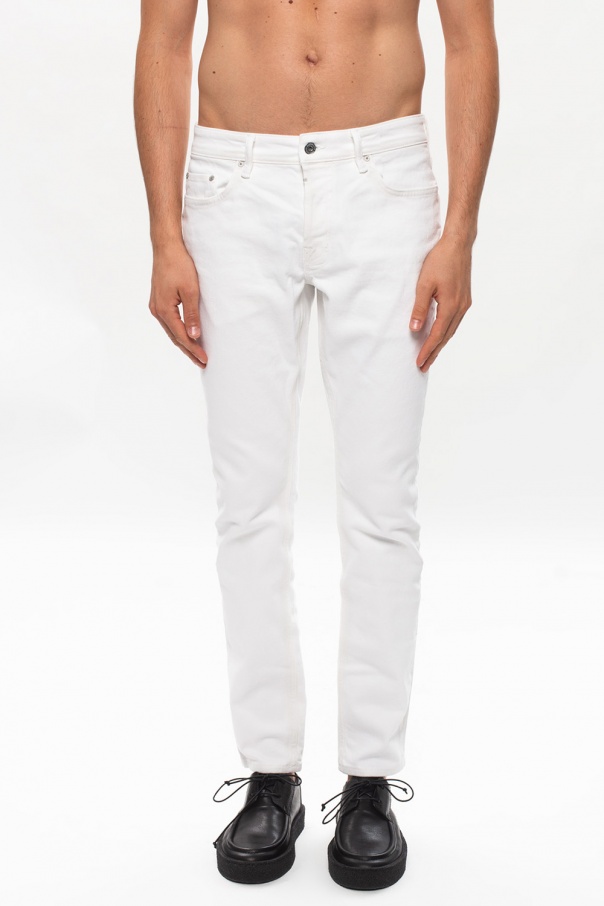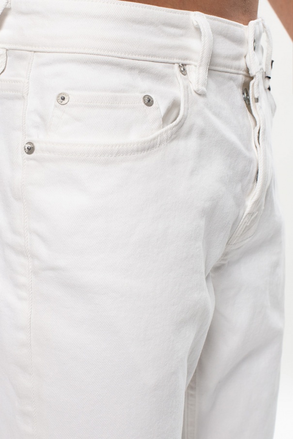 White ‘Rex’ jeans from AllSaints. Fastened with buttons, this straight leg design features a logo patch and five slip pockets.