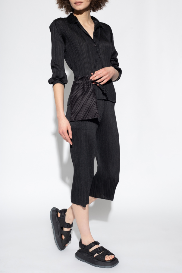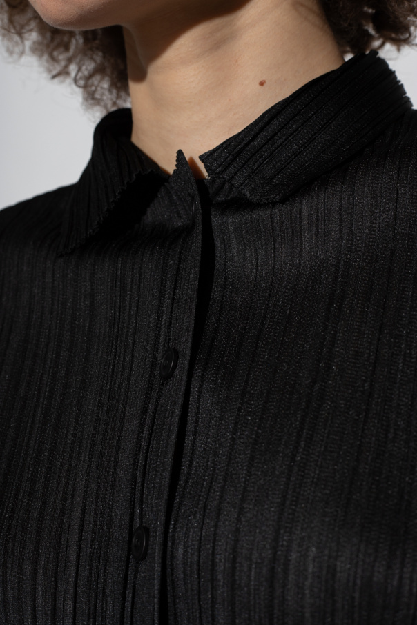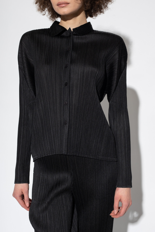 Black shirt from Issey Miyake Pleats Please. Distinguished by the brand\'s signature pleating technique, this style features button fastenings and long sleeves.