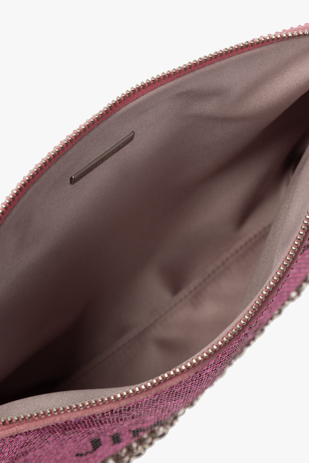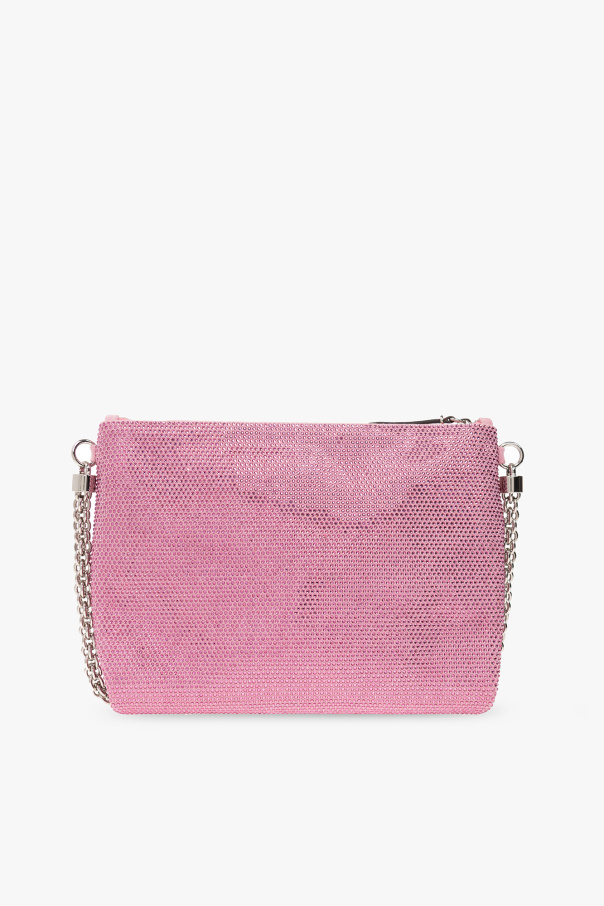 Pink ‘Callie’ shoulder bag from Jimmy Choo. Crafted from suede and spruced up with glossy crystals all over, this design secures with a zip and showcases a dark grey printed logo on the front, a chain shoulder strap and a satin-clad interior.