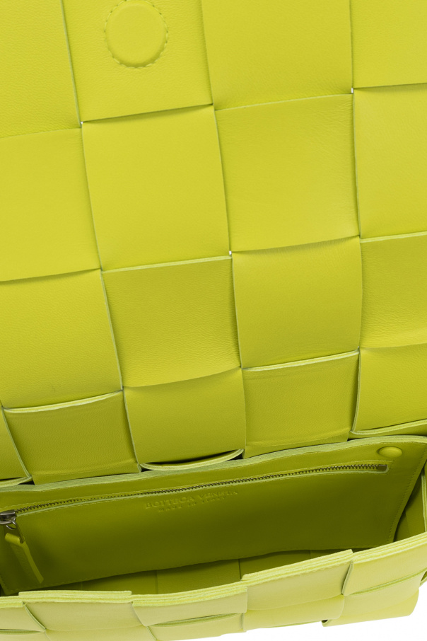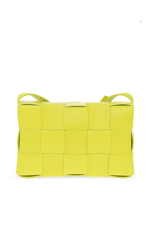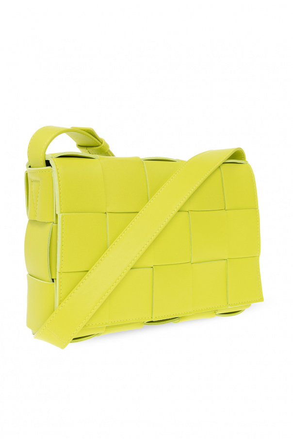 Greenish yellow ‘Cassette Small’ shoulder bag from Bottega Veneta. Made of lamb leather with the label’s signature Intreccio weave, this model features a fold-over top with a snap fastening, adjustable shoulder straps, silver-tone metal hardware and one internal compartment with one zip pocket.