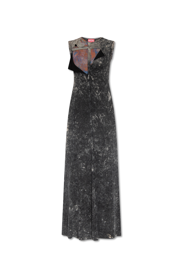Dark grey ‘D-TREATY’ dress from Diesel. This design features a two-layered front with slits, printed pattern in orange and navy as well as a round neck and raw cut edges.
