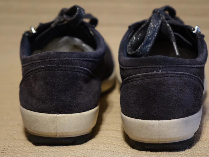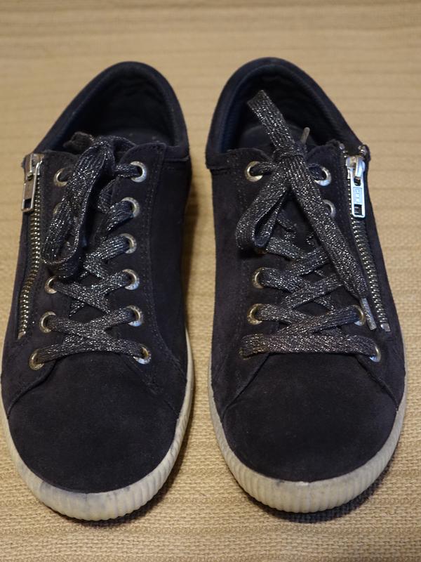 Модель выполнена в стиле минимализма, имитирует низкие кеды. Верх изделия представляет собой толстую мягкую натуральную замшу темно-синего цвета . Обувь фиксируется на ноге при помощи 6 пар больших фирменных люверсов и широких плоских шнурков блестящего серебристо серого цвета. Вдоль планки для шнурования на наружной боковой поверхности вшита действующая металлическая молния, облегчающая процесс надевания и снимания обуви. Все детали изделия отстрочены ровным швом прочными нитками темно-синего цвета.