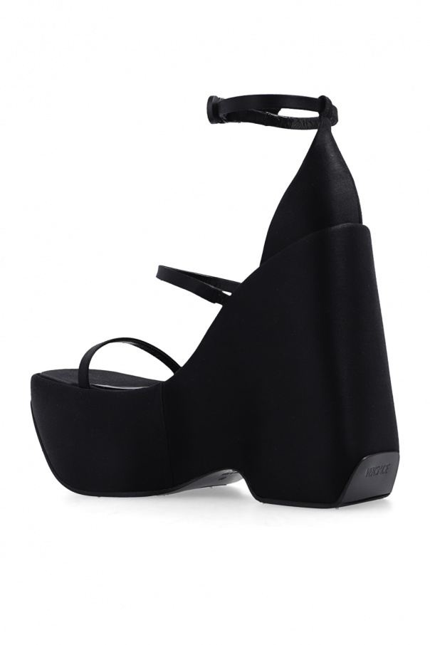 Black ‘Triplatform’ wedge sandals from Versace. Crafted from satin, this pair features an ankle strap with a Medusa head safety pin, embossed logo on the front and back, square toe and black leather sole trimmed with rubber.