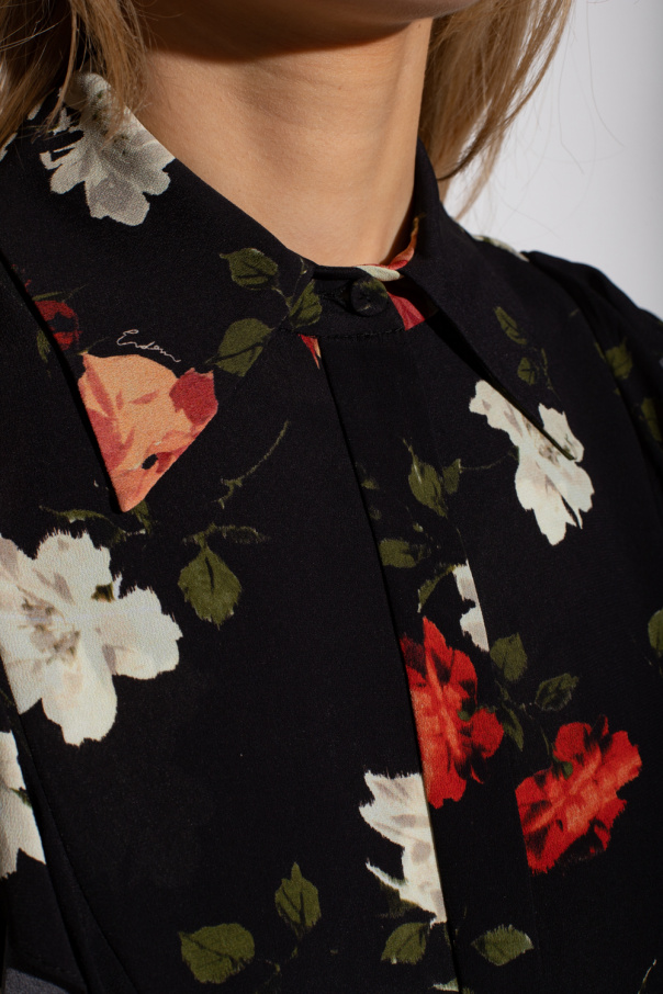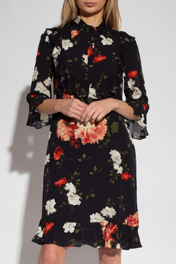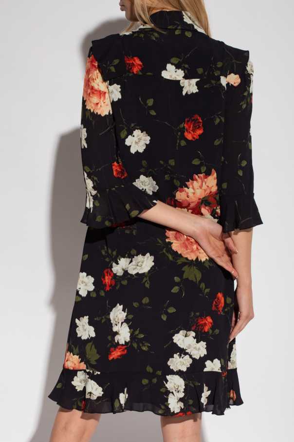 Black ‘Bell’ loose-fitting dress from Erdem. Fastened with buttons, this garment features 3/4 length sleeves, a Sitwell Bloom motif depicting roses and peonies as well as ruffles at the neck, cuffs and hem.