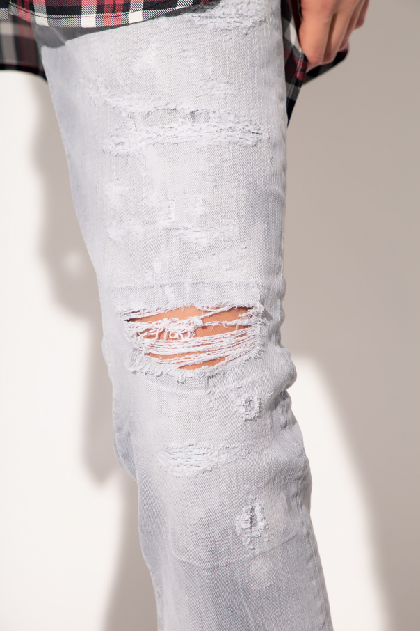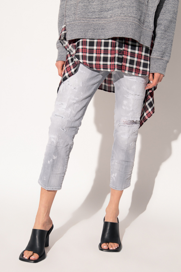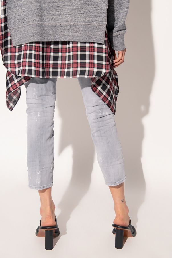 Light grey ‘Cool Girl Cropped’ distressed jeans from Dsquared2. Fastened with buttons, this pair features a white paint splatter effect, red logo patch on the front, white and black patch at the back and cropped tapered legs.