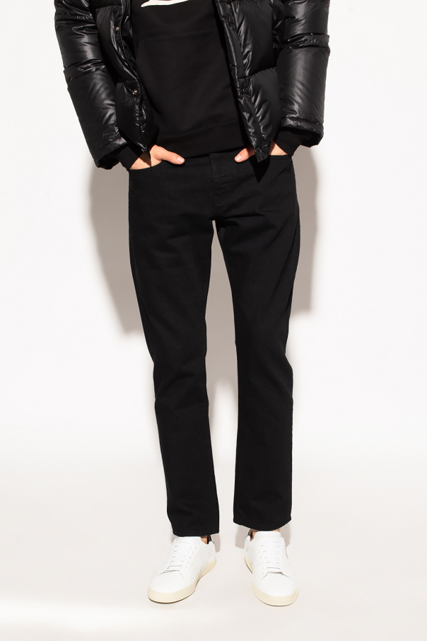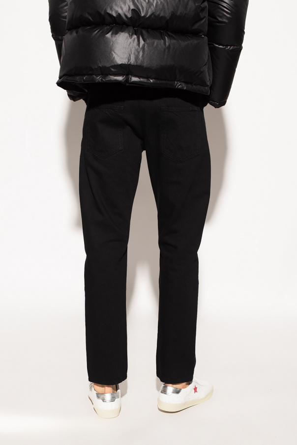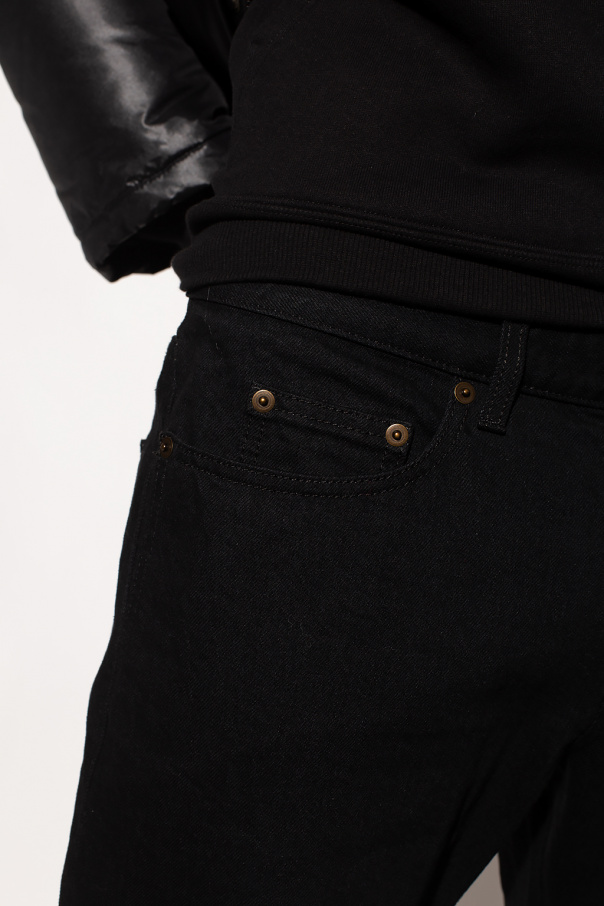 Black distressed jeans from Saint Laurent. Fastened with buttons, this pair falls down with tapered legs and is complete with a logo-embossed appliqué, two front pockets and two back pockets.
