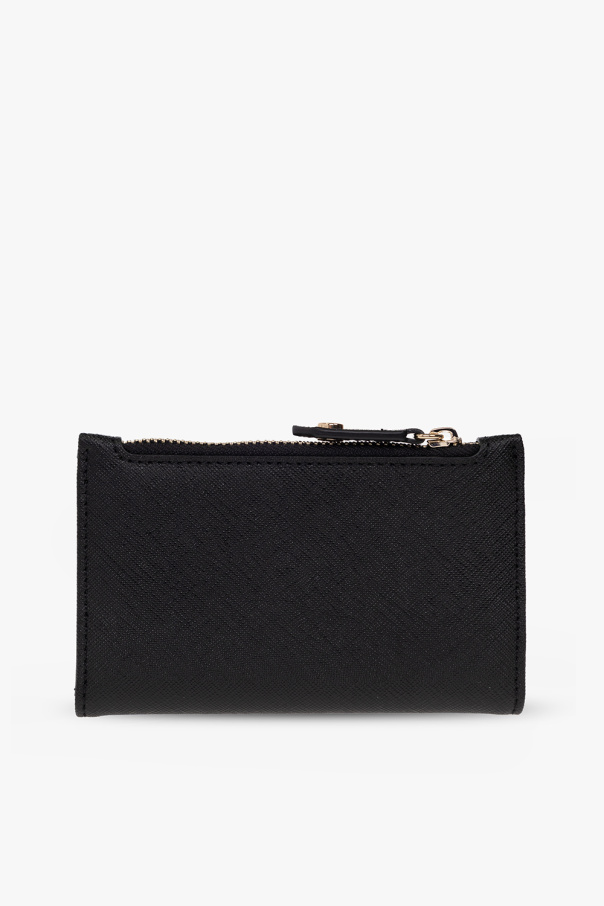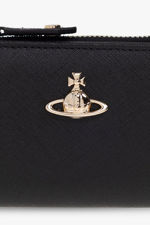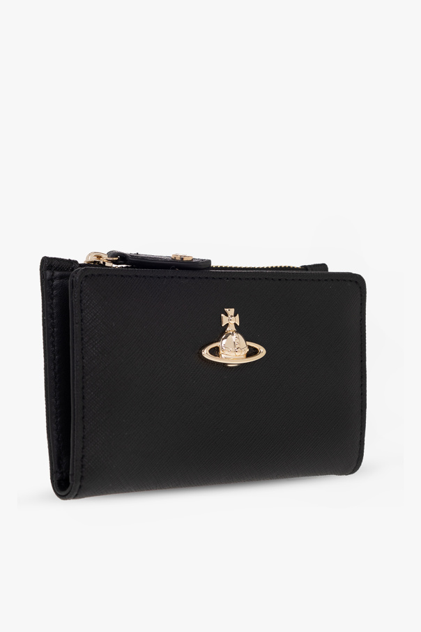 Black wallet from Vivienne Westwood. Crafted from Saffiano leather, this item fastens with a snap and showcases a gold-tone metal logo plaque on the front, one zip pocket and two slip pockets and six card slots inside.