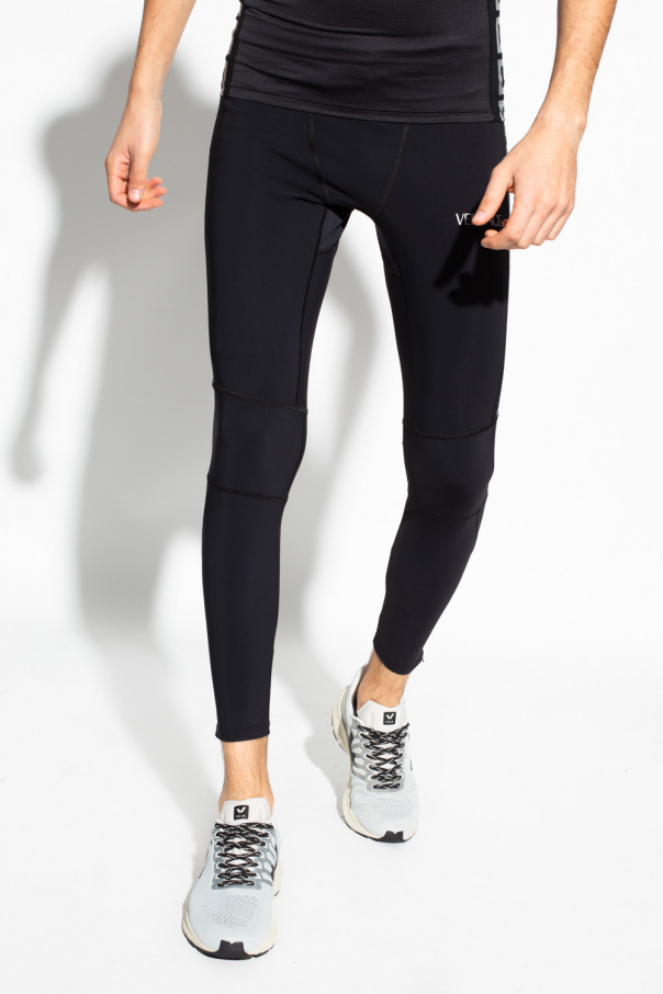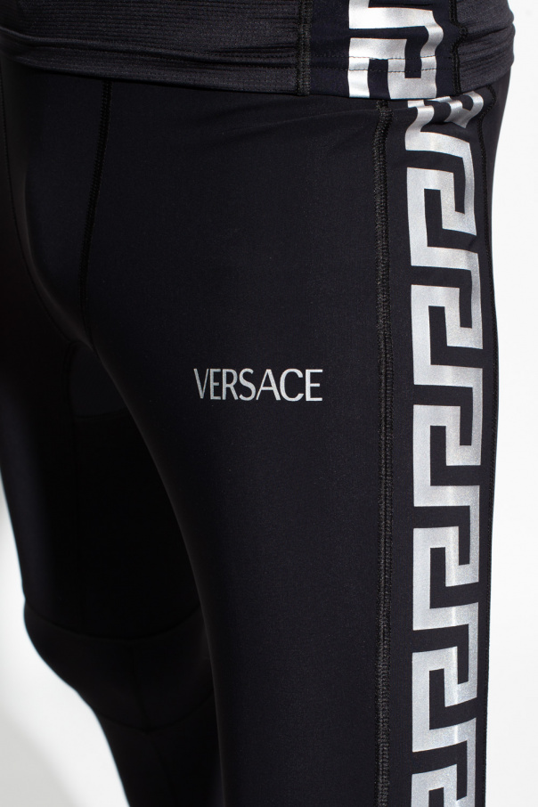 Black leggings from Versace. This pair falls down with tapered legs and features a logo detail, silver-tone monogram and zip details.