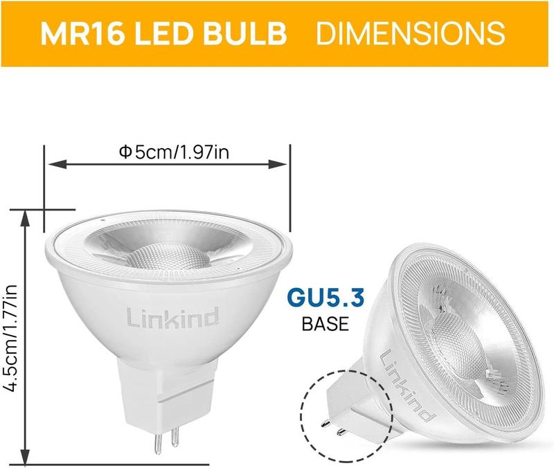 - ✔️[36° концентроване освітлення] — Світлодіодна лампа MR16 має кут 36° і світловий потік 465 лм, випромінює затишне тепле біле світло 2700 К через матовий відбивач без відблисків і мерехтіння. Ідеально підходить для вітальні, кухні, спальні, готелів тощо.