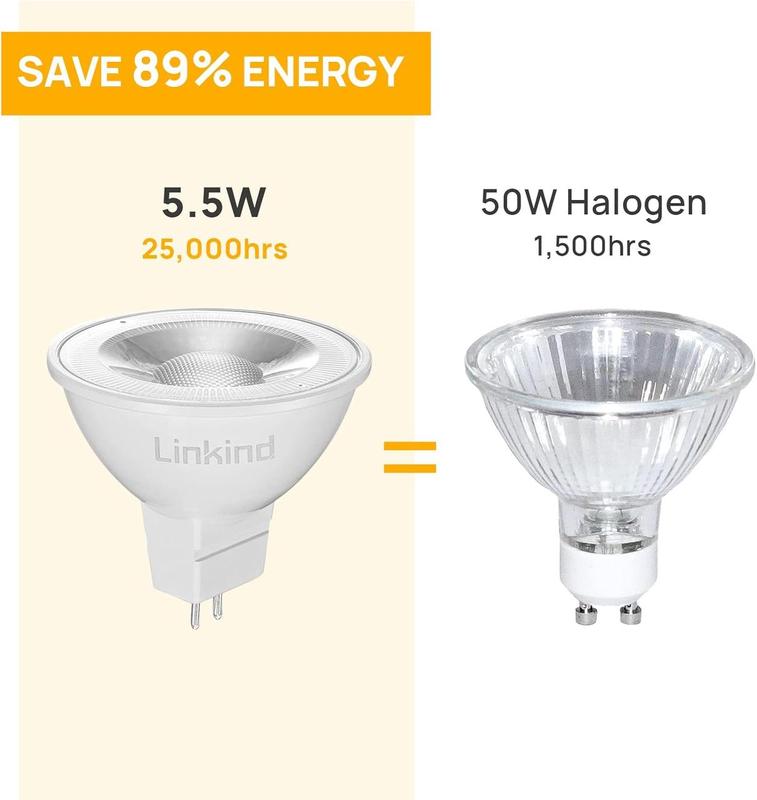 - ✔️[90% економії енергії] — світлодіодна лампа GU5.3 потужністю 5,5 Вт може замінити звичайну лампу потужністю 50 Вт і сумісна зі стандартним цоколем MR16/GU5.3. Заощаджуйте понад 90% на витратах на електроенергію.
