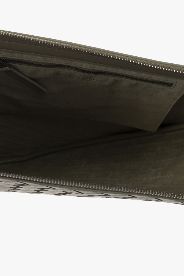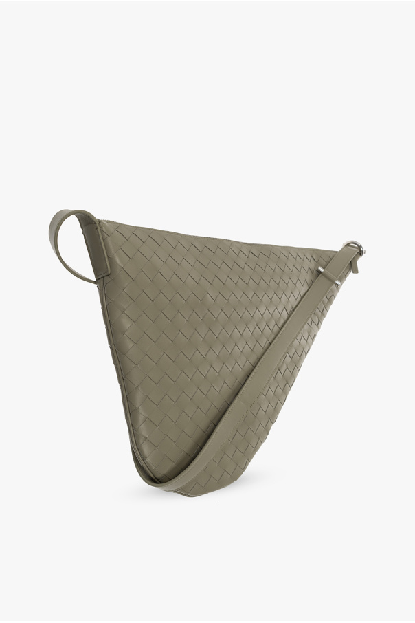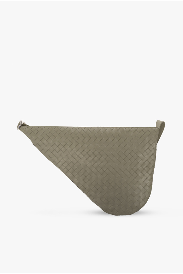 Greenish grey ‘Virgule’ shoulder bag from Bottega Veneta. Crafted from calf leather with an asymmetrical silhouette, this design fastens with a zip and showcases the brand's signature ‘Intrecciato’ weave. It is complete with an adjustable shoulder strap, silver-tone metal hardware and one internal compartment with a zip pocket.