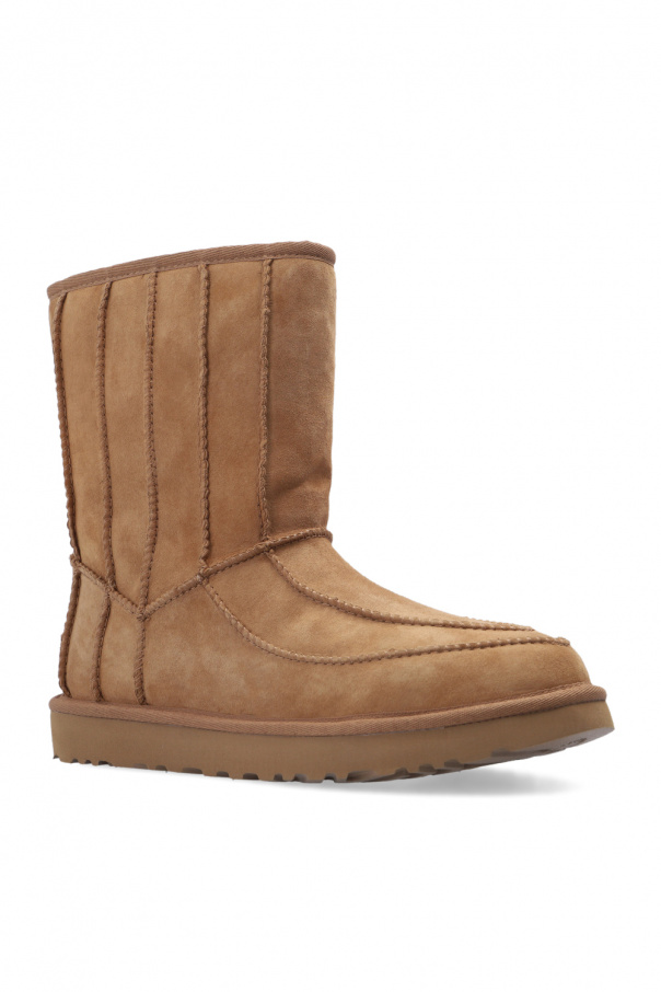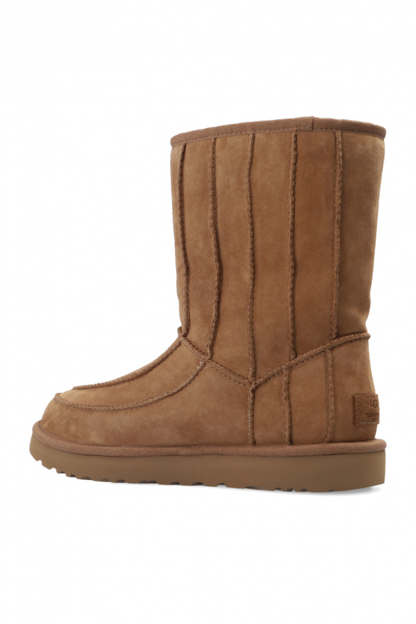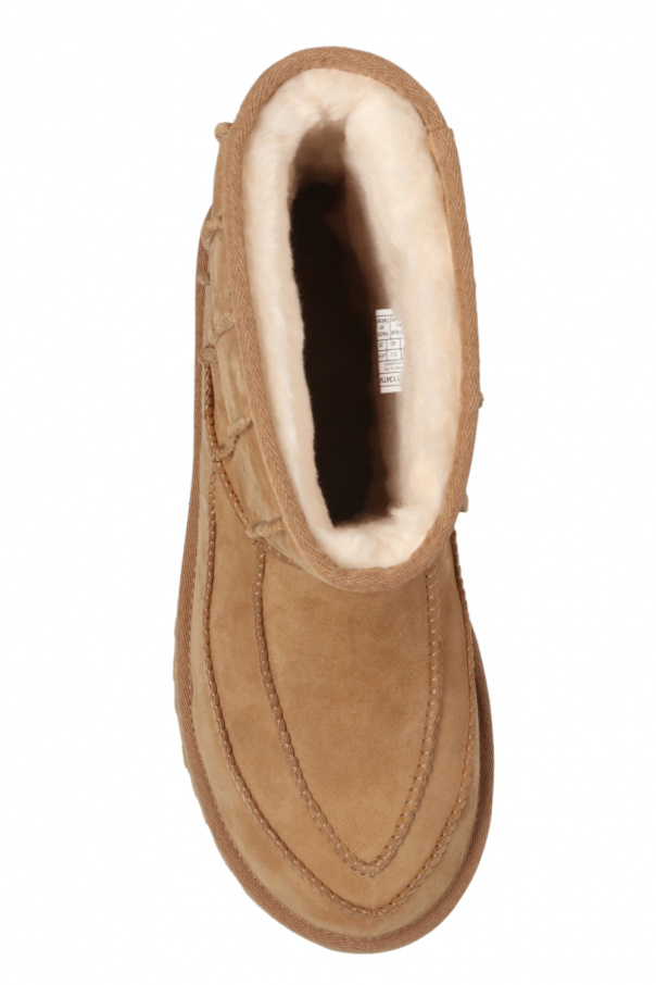 Brown ‘Classic Repeated Mini’ snow boots from UGG x Tschabalala Self. Made of leather, this model features stitching details inspired by Tschabalala’s sculpture ‘Loveseat’, a patch with the collaboration logo, cream lining made of recycled wool blend UGG Plush™ and brown Treadlite by UGG™ sole made of rubber. The model comes from UGG’s collaboration with American artist Tschabalala Self known for her depictions of Black female figures using paint, fabric, and discarded pieces of her past works.