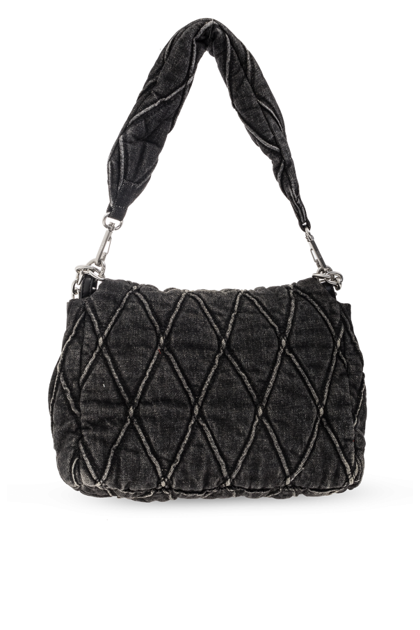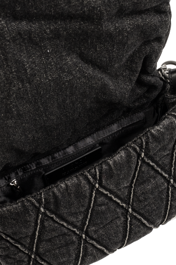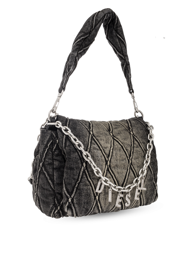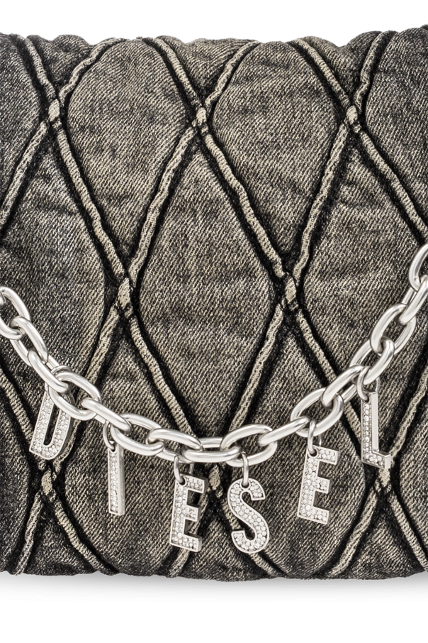 Dark grey ‘Charm-D Medium’ denim shoulder bag from Diesel. Made of denim with a washed effect. This design features magnetic snap fastenings, logo chain with crystals, two shoulder straps, silver-tone metal hardware and one internal compartment with one zip pocket.