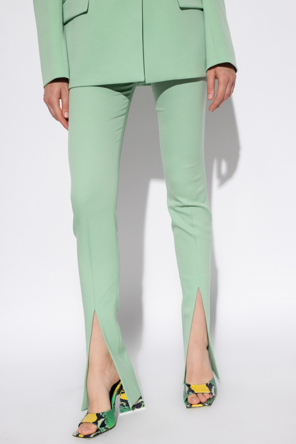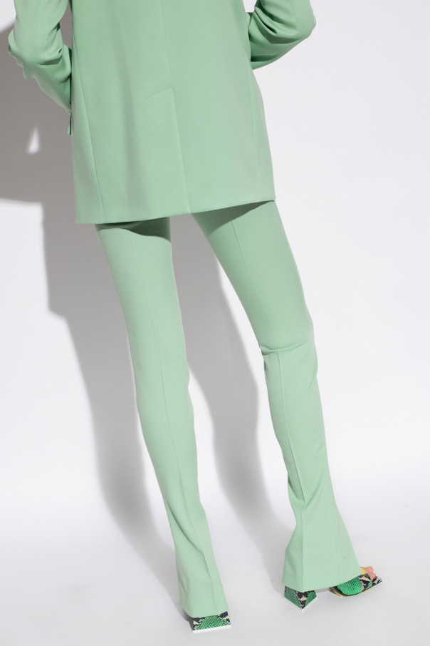 Light green trousers from The Attico. Crafted from wool, this pair features a zip fly with a button and hook, two front slip pockets, pleat detailing and slitted hems.