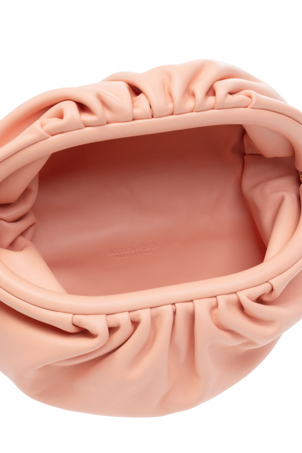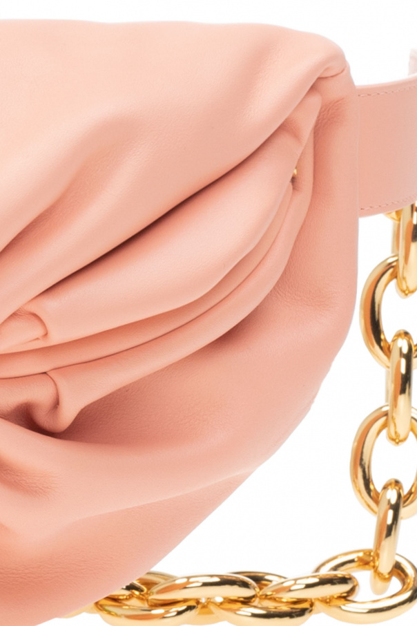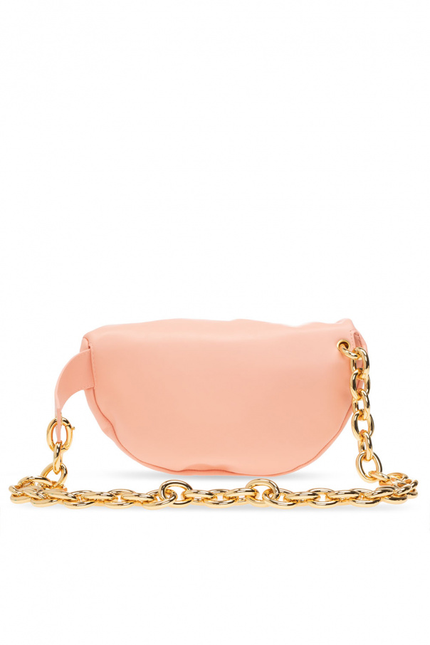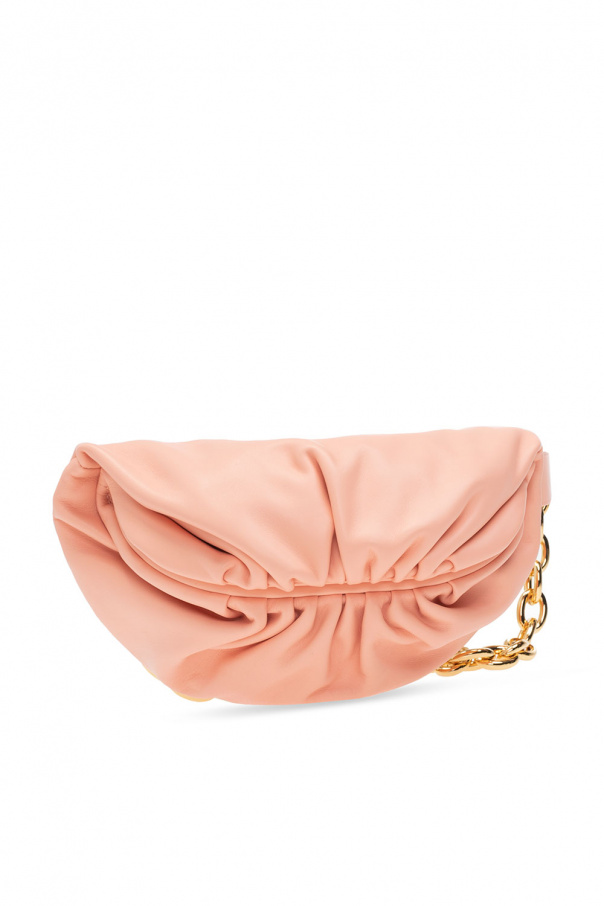 Orange and pink belt bag from Bottega Veneta. Size medium. Crafted from calf leather with ruched details, this design fastens via a magnetic snap and features a chain strap, gold-tone metal hardware and one internal compartment.