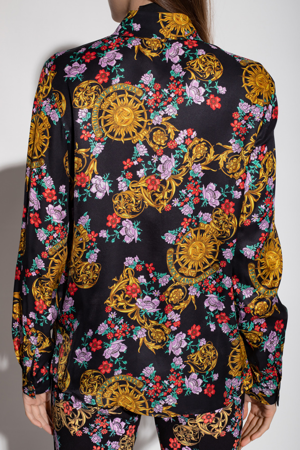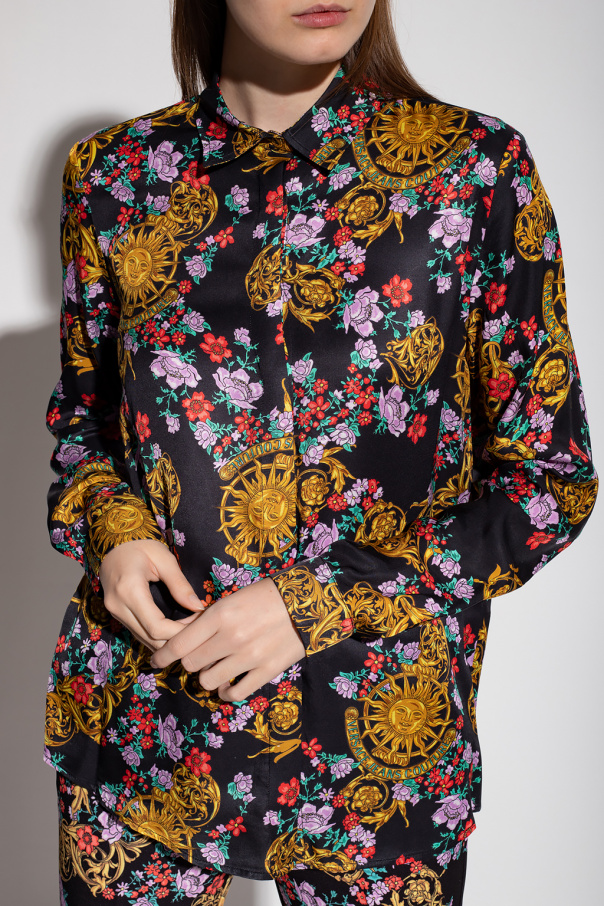 Black shirt from Versace Jeans Couture. Fastened with concealed buttons, this garment features a multicolored ‘Sun Flower Garland’ pattern and long sleeves with button cuffs.