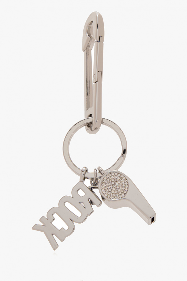 Silver-tone ‘Rock’ key ring from Zadig & Voltaire. Made from brass, this item features a safety-pin pendant and a crystal-bejewelled whistle charm with Rock lettering.