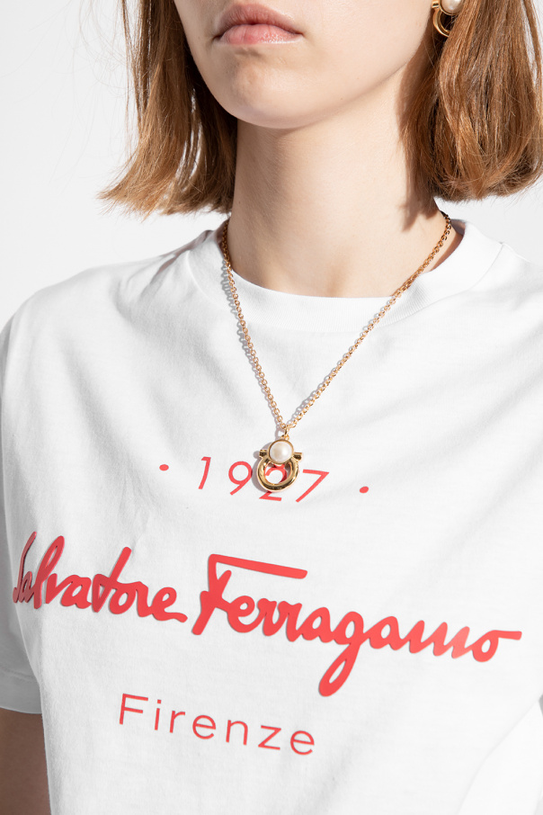 Gold-tone necklace from Salvatore Ferragamo. Made of brass, this item features a Gancini logo charm with a glass pearl and adjustable snap hook.