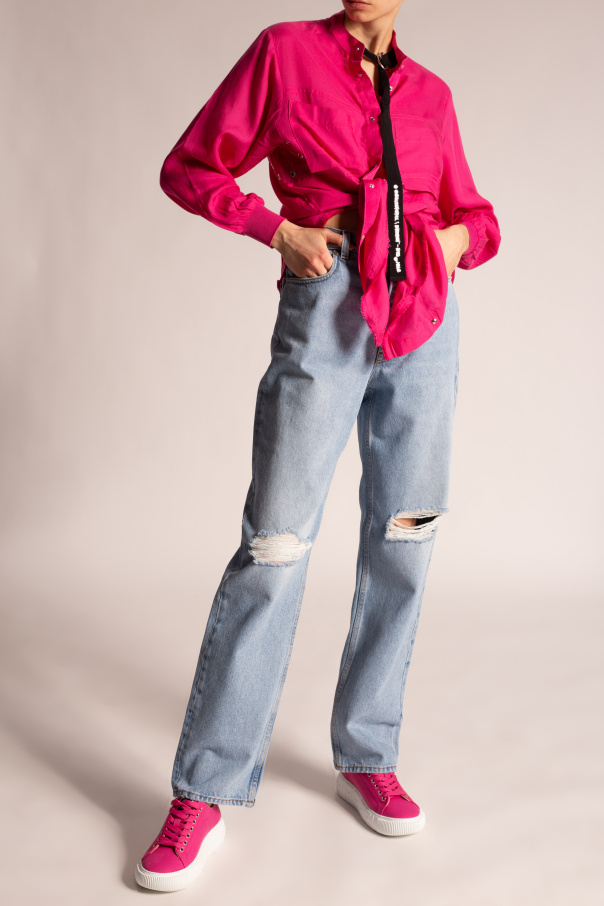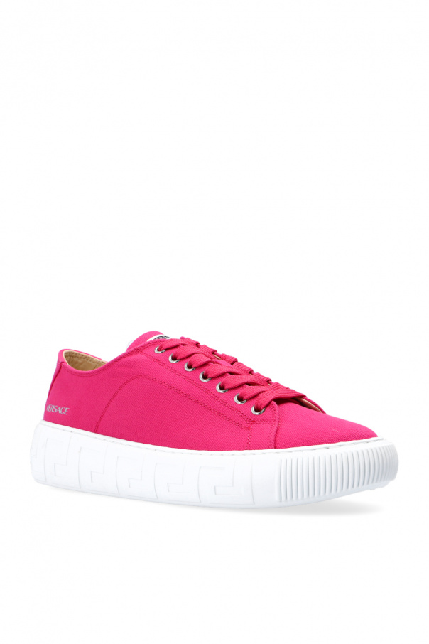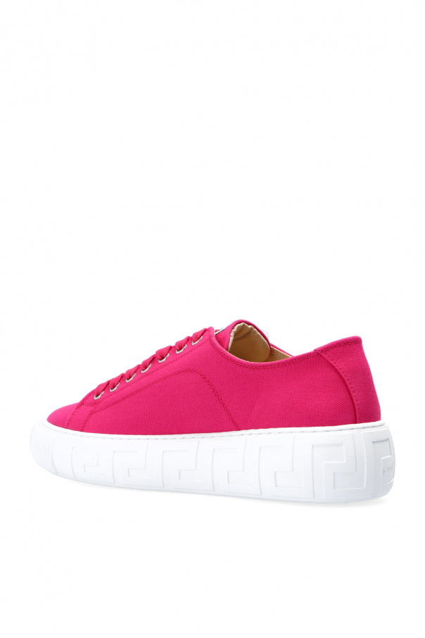 Dark pink sneakers from Versace. Made of canvas, this lace-up pair sits on a white rubber sole and features a tongue patch and a silver-tone logo printed on the side.
