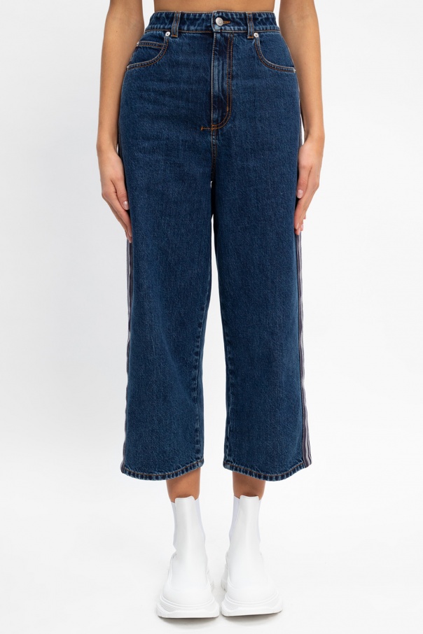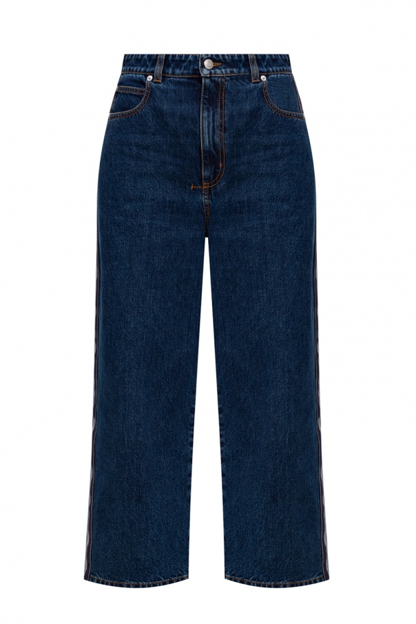 Blue jeans from Alexander McQueen. Fastened with a zip and button, this tapered leg design features exposed stitching in orange, a brown logo patch, three front pockets, two back pockets as well as side stripes in navy and white.