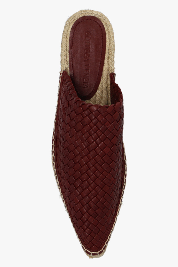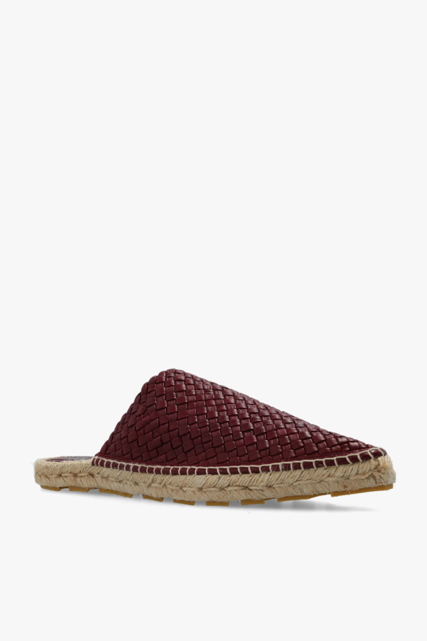 Reddish brown ‘Merlot’ espadrilles from Bottega Veneta. Made of leather with the brand’s signature Intrecciato weave, this pair features a pointed toe and decorative woven sole with a beige rubber trims.