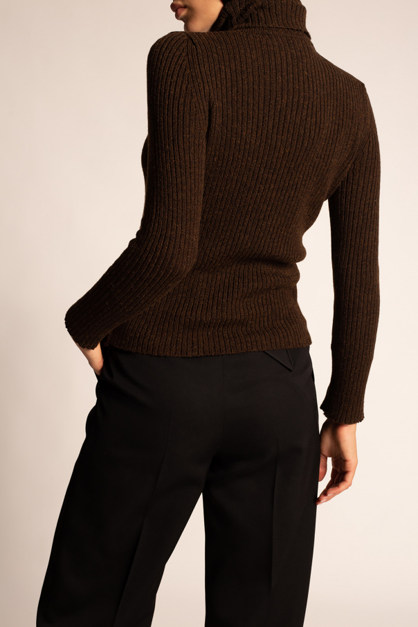 Brown knitted turtleneck sweater from Saint Laurent. Crafted from camel hair, this long-sleeved style showcases a gold-tone metal logo plaque.