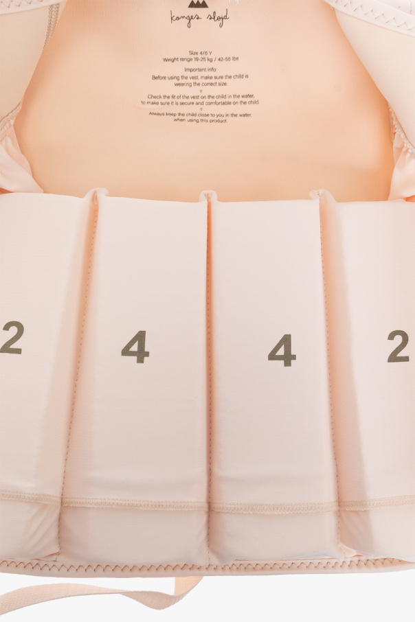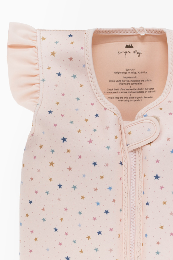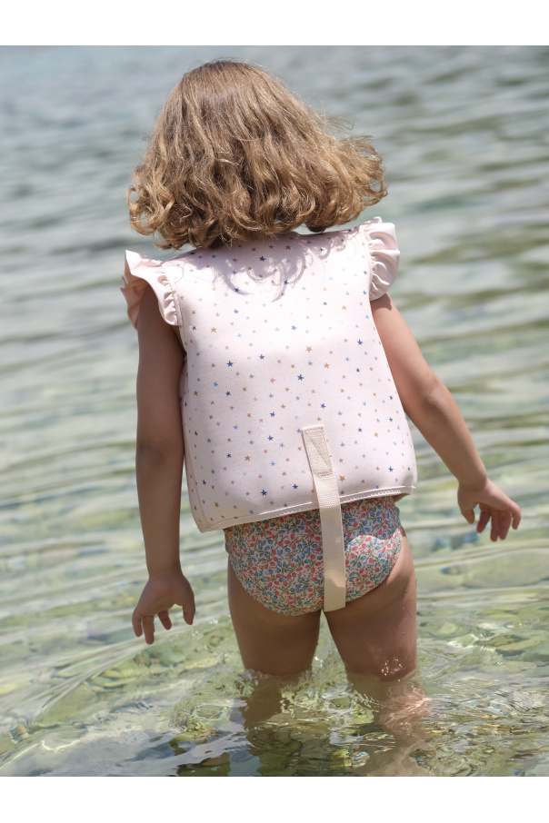 Light pink float vest from Konges Slojd. Made in neoprene and decorated with a stars print, this item fastens with a zipper, velcro and buckle straps and features a corrugated strap at the back. This is not a lifesaving device. Can be used as a replacement for water-wings or inflatable wheels. Only to be used in water in which the child is within its depth. Will not protect against drowning. Use only under constant supervision. Not for use when sailing / boating.