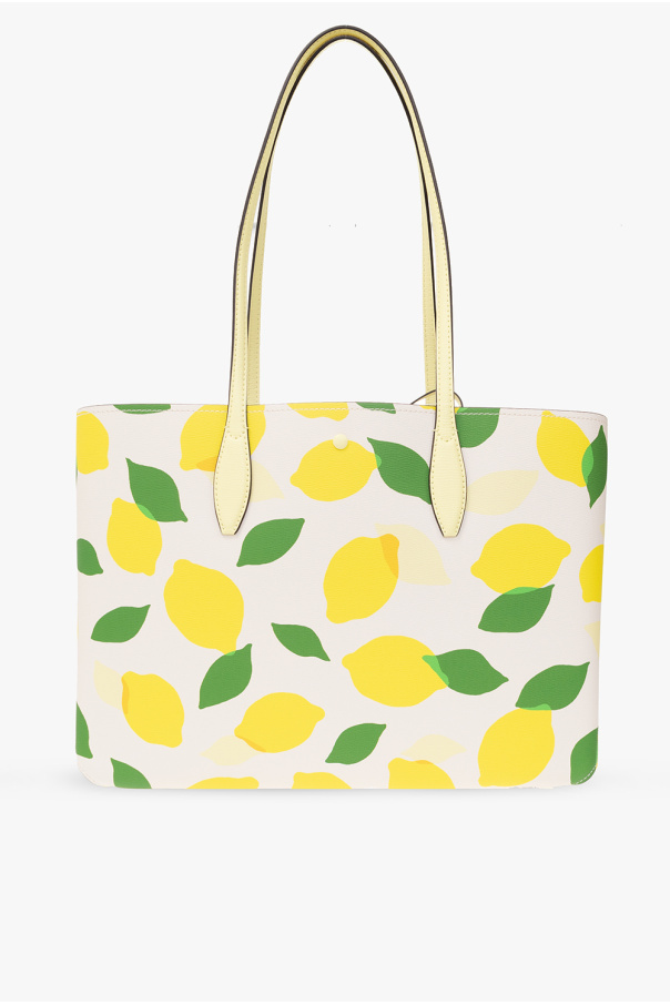 White \'All Day Large\' shopper bag from Kate Spade. Made of leather, this model is complete with a carabiner closure, yellow and green lemon pattern, two half-round handles, gold-tone metal hardware and one internal compartment with a detachable pouch on a strap.