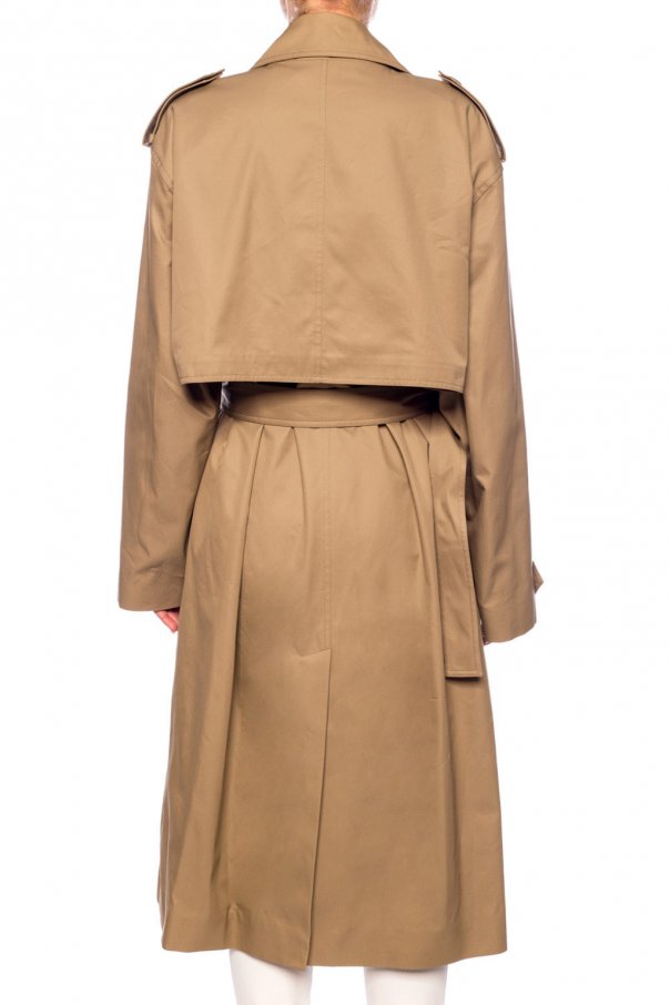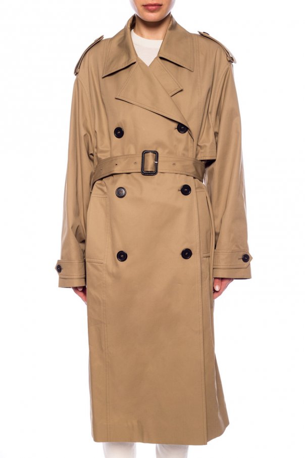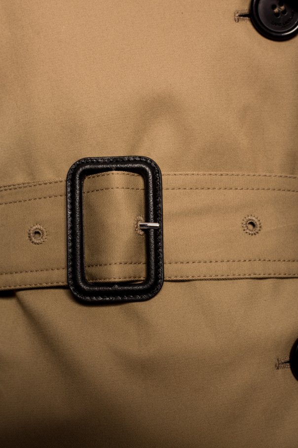 Beige double-breasted trench coat with notch lapels from Saint Laurent. Made of cotton. Fastened with buttons. Adjustable belt at the waist. Two slip pockets on the front. Single rear vent. Padded shoulders.