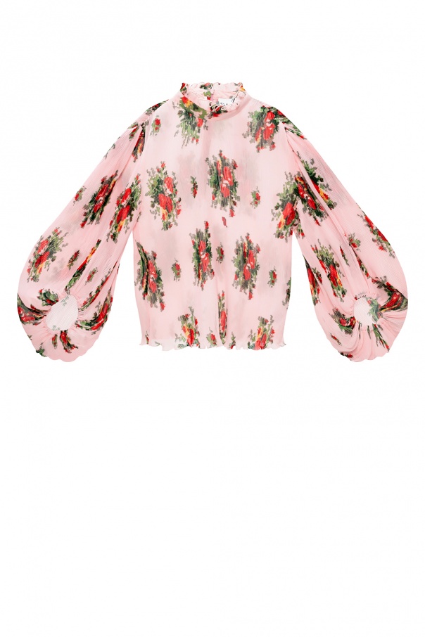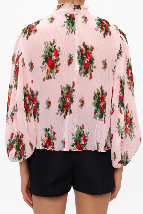 Light pink top from Ganni. Crafted from recycled polyester in a pleated design, this piece has hidden zip fastening on the back, a green and red floral pocket and wide legs finished with elastic.