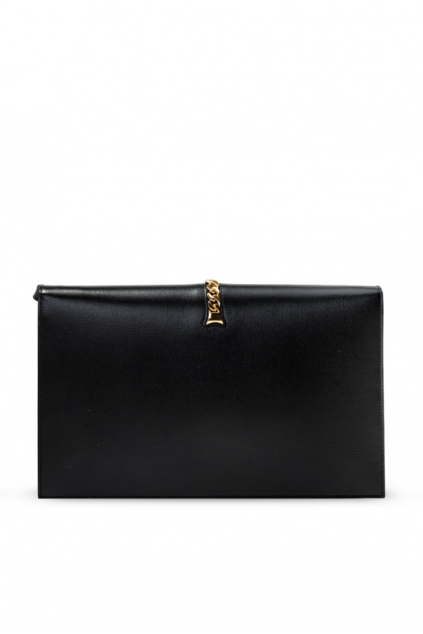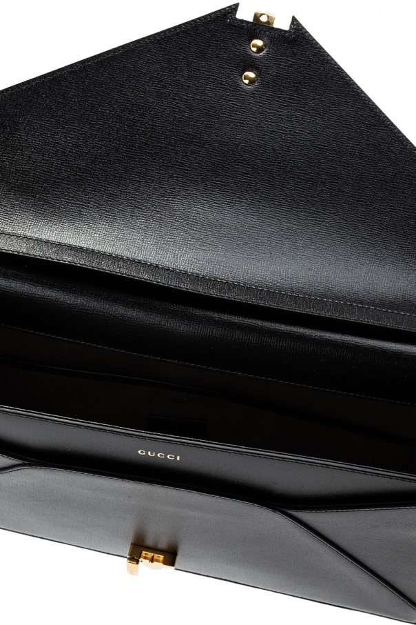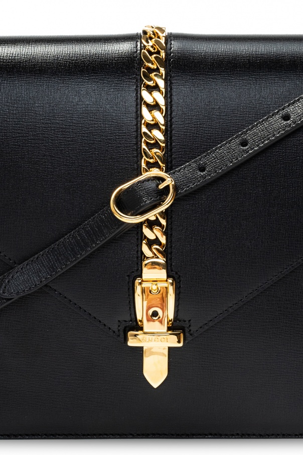 Black shoulder bag from Gucci. Crafted from leather, this design showcases a decorative metal chain and buckle closure. It is complete with an adjustable shoulder strap, gold-tone metal hardware and interior with one compartment and two pockets.