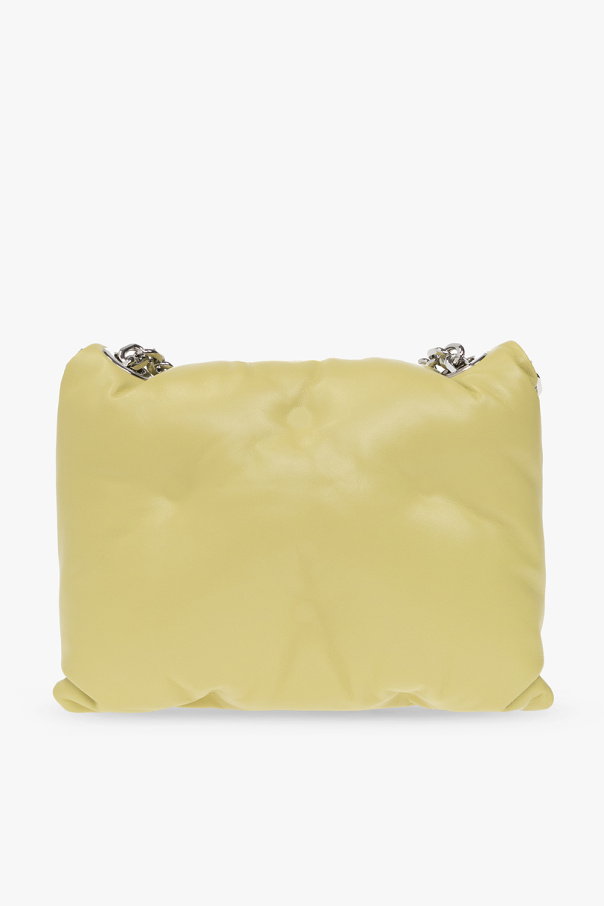 Light green ‘Glam Slam Mini’ quilted shoulder bag from Maison Margiela. Made of lamb leather, this model features a magnetic snap, numerical logo in white and black, detachable shoulder chain, one internal compartment and silver-tone metal hardware.
