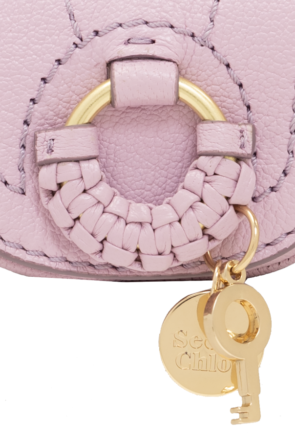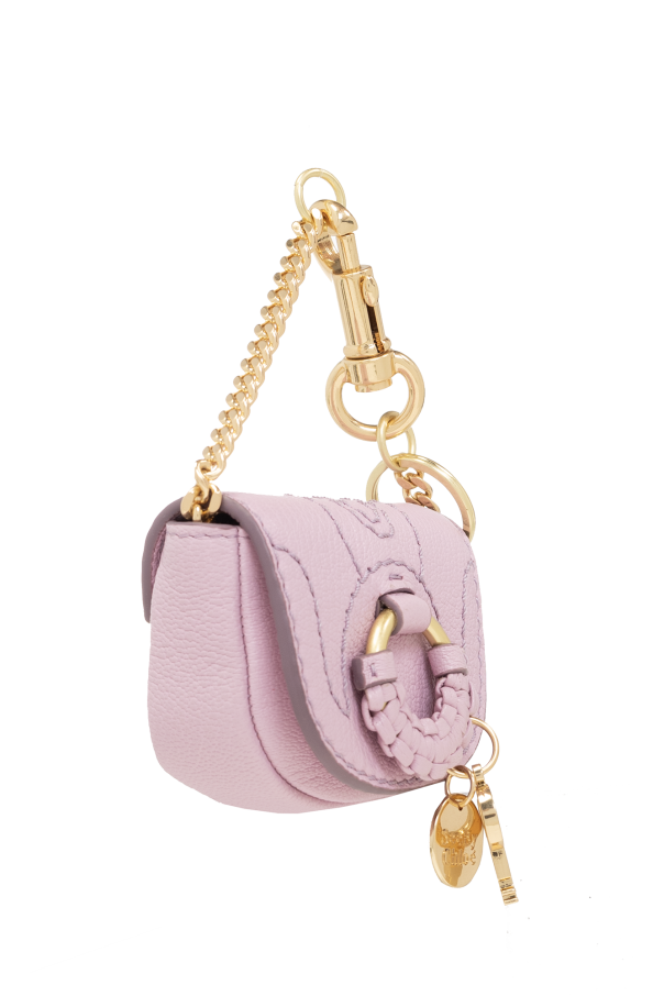 Pinkish purple key holder from See By Chloe. Made of goat leather, this item fastens with a snap and showcases a braided ring with charms and embossed logo on the front. It is complete with one internal compartment and antiqued gold-tone metal hardware, including a chain and lobster clasp.
