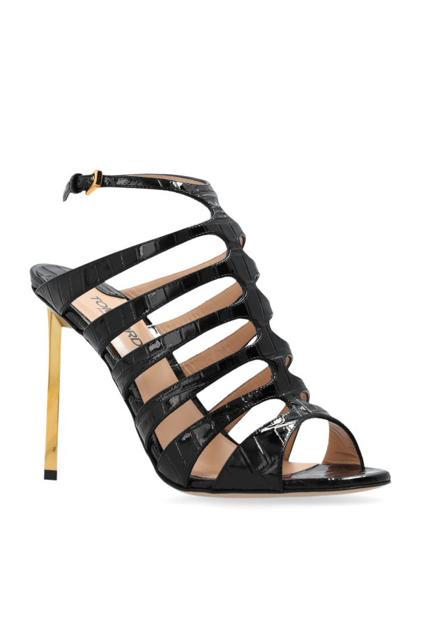 Introducing the epitome of sophistication and allure: Tom Ford\'s High-Heeled Sandals. Crafted with meticulous attention to detail, these sandals are the quintessence of luxury footwear, designed to elevate any ensemble with their refined aesthetics. The sandals\' dominant black hue is complemented by the lustrous sheen of high-quality leather, creating a striking contrast with the golden, slender heel that exudes opulence. The intricate cage-like structure formed by multiple thin straps, combined with vertical elements, wraps elegantly around the foot, showcasing an exquisite and elegant design. This dazzling array is further enhanced by the metallic gleam of the heel, adding a touch of glamour to the matte black straps. Not only do these sandals boast a visually stunning design, but they also offer practicality with an ankle strap and buckle closure, ensuring a customizable fit and ample support. The inner sole is adorned with the signature Tom Ford logo, a testament to the sandals\' authenticity and designer craftsmanship. Furthermore, the sole is crafted from premium leather, promising durability and comfort. Why Purchase These Heeled Sandals? Elegant design with luxurious materials Adjustable ankle strap for a secure and comfortable fit Signature Tom Ford branding, confirming authenticity Perfect for special occasions and evening wear