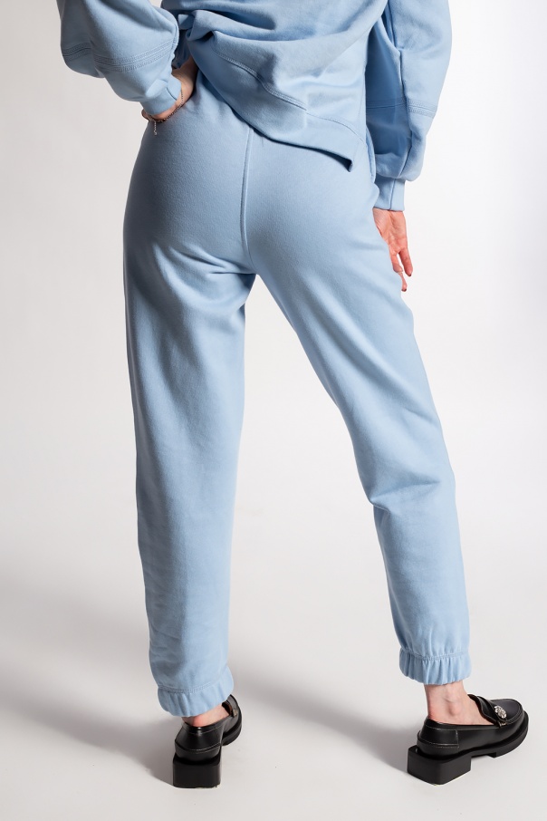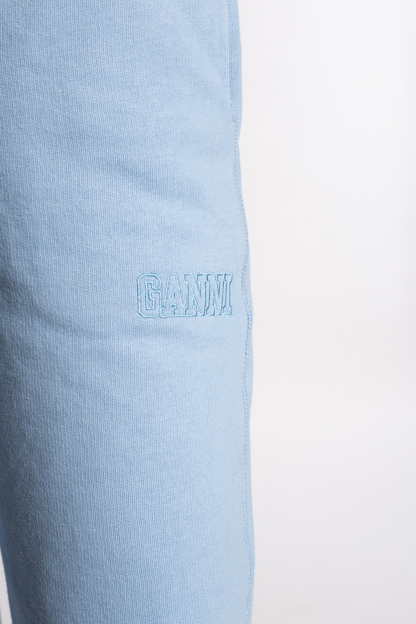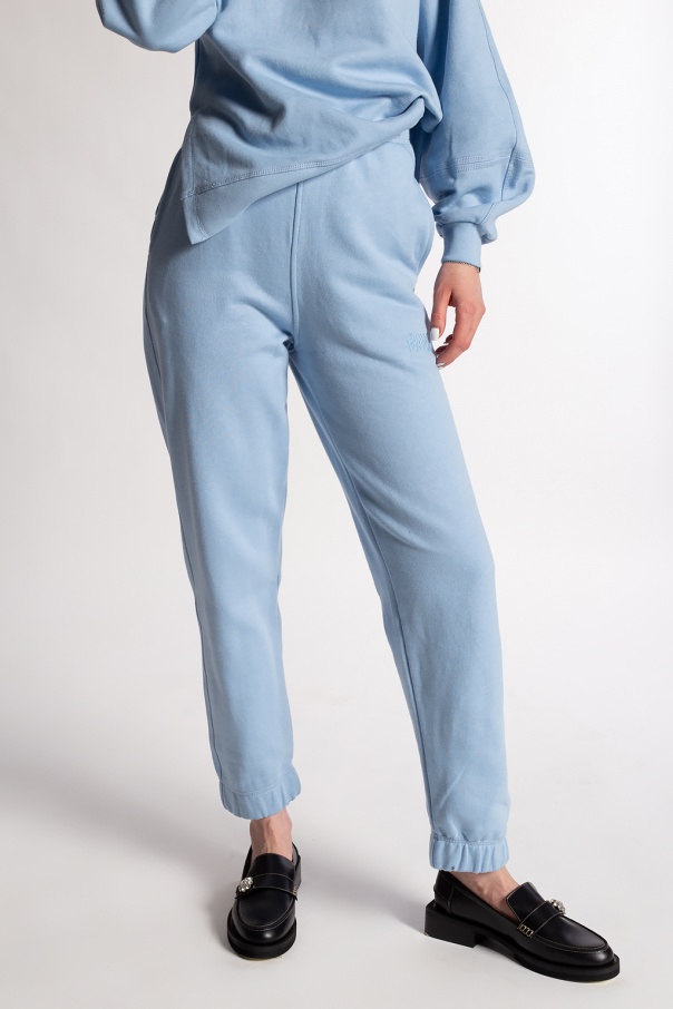 Light blue sweatpants from Ganni. Crafted from certified recycled EcoLife® yarn, this long-sleeved design features an elasticated drawstring waistband, two slip pockets and ribbed cuffs. EcoLife® is made from 50% post-consumer recycled polyester, such as PET plastic bottles, and 50% pre-consumer recycled cotton from end-of-line manufacturing scraps that would otherwise go to waste.