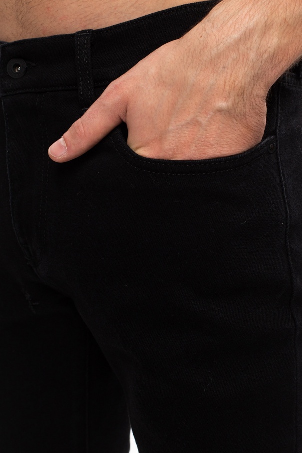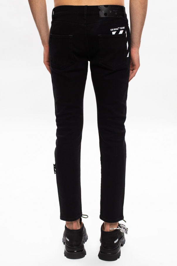 Black jeans from Off-White. Fastened with a zip and button, this tapered leg design features a printed logo pattern in white, two front pockets and two rear pockets.
